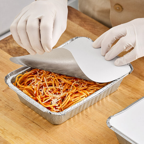 Enhance food freshness and transport with Western Plastics foil-laminated board lid for 2.25 lb. containers. The foil side retains heat, while the plain white side allows for easy labeling. Made for 2.25 lb. foil containers (sold separately). Professional-grade for reliable usage.
