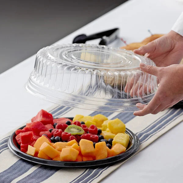 Made from high-quality, crystal clear plastic, this 12in dome lid is perfect for transporting sandwiches, baked goods, and fruit platters without worrying about spills or messes. Its sturdy design ensures secure transportation and its clear material allows for easy visibility of the contents.