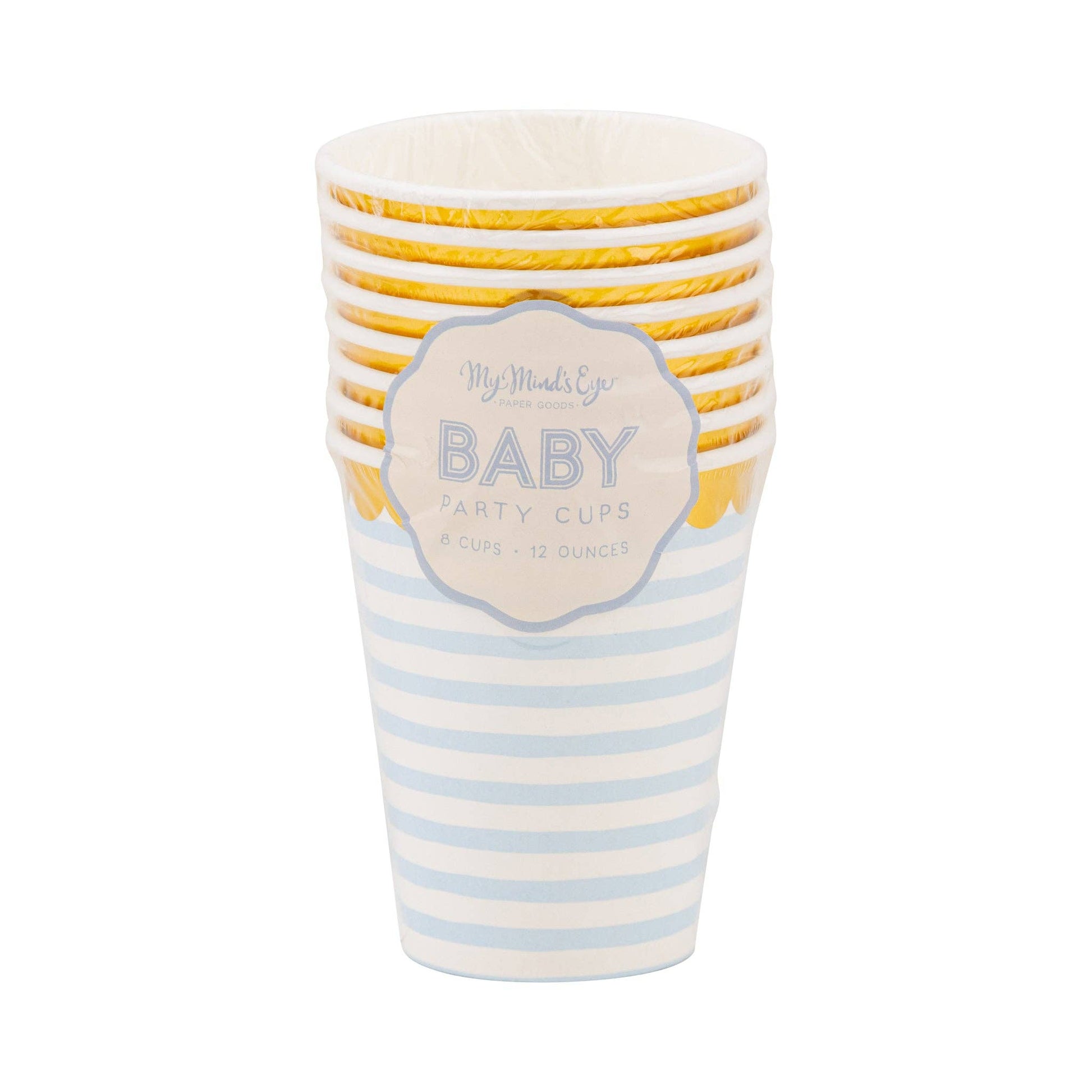 Celebrate your little boy’s special day with the Baby Blue Party Cup. Featuring charming blue stripes, this cup adds a festive touch to baby showers and birthday parties. Perfect for serving drinks with style, it complements any blue-themed celebration while keeping the party fun and elegant. • 8 cups per package • 12 oz cups • 4.5" tall and 3.5" round at top • gold foil