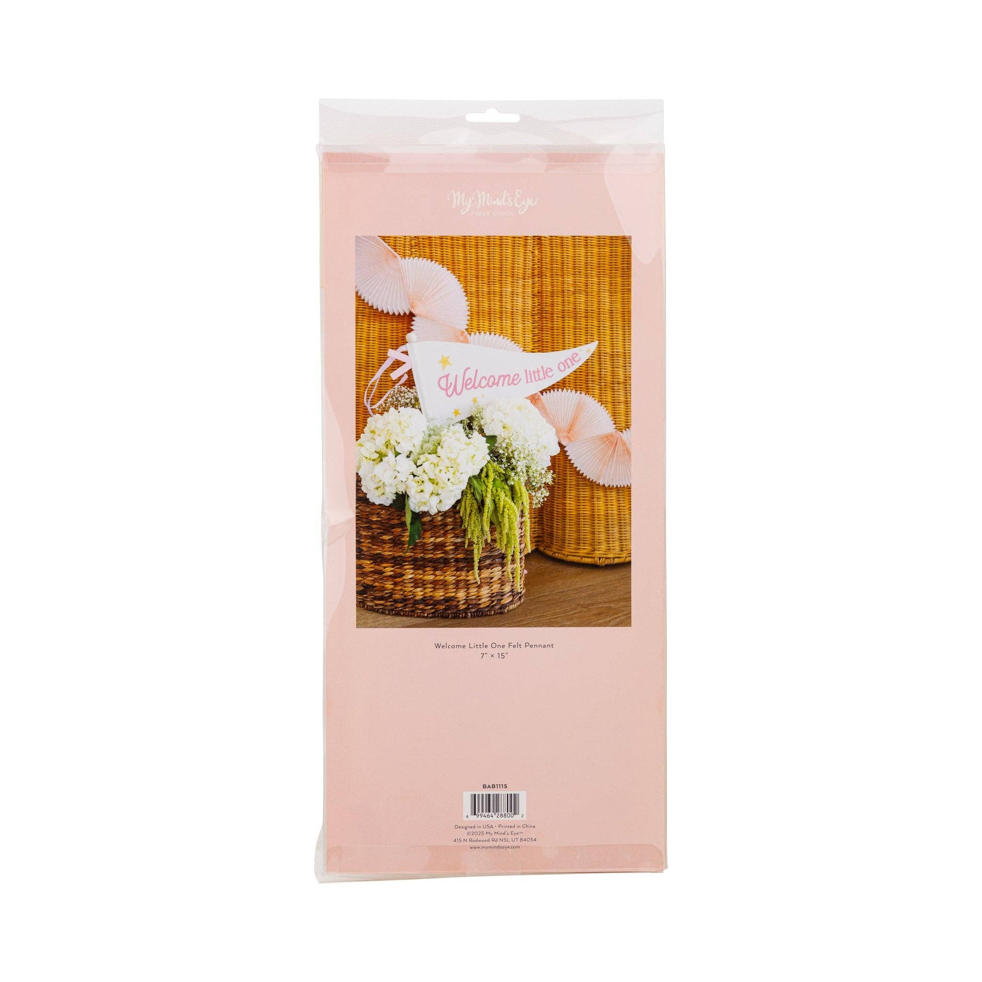 Celebrate your new arrival with the Welcome Little One Pink Pennant, the perfect decoration for a baby shower or nursery. This charming pink pennant adds a festive, joyful touch to your party, creating a warm and inviting atmosphere. Easy to display and reusable, it’s an ideal gift or decor piece to welcome your little one in style. • includes 1 - 14" wood dowel • Felt pennant is 6" tall x 15" long • Ribbon included