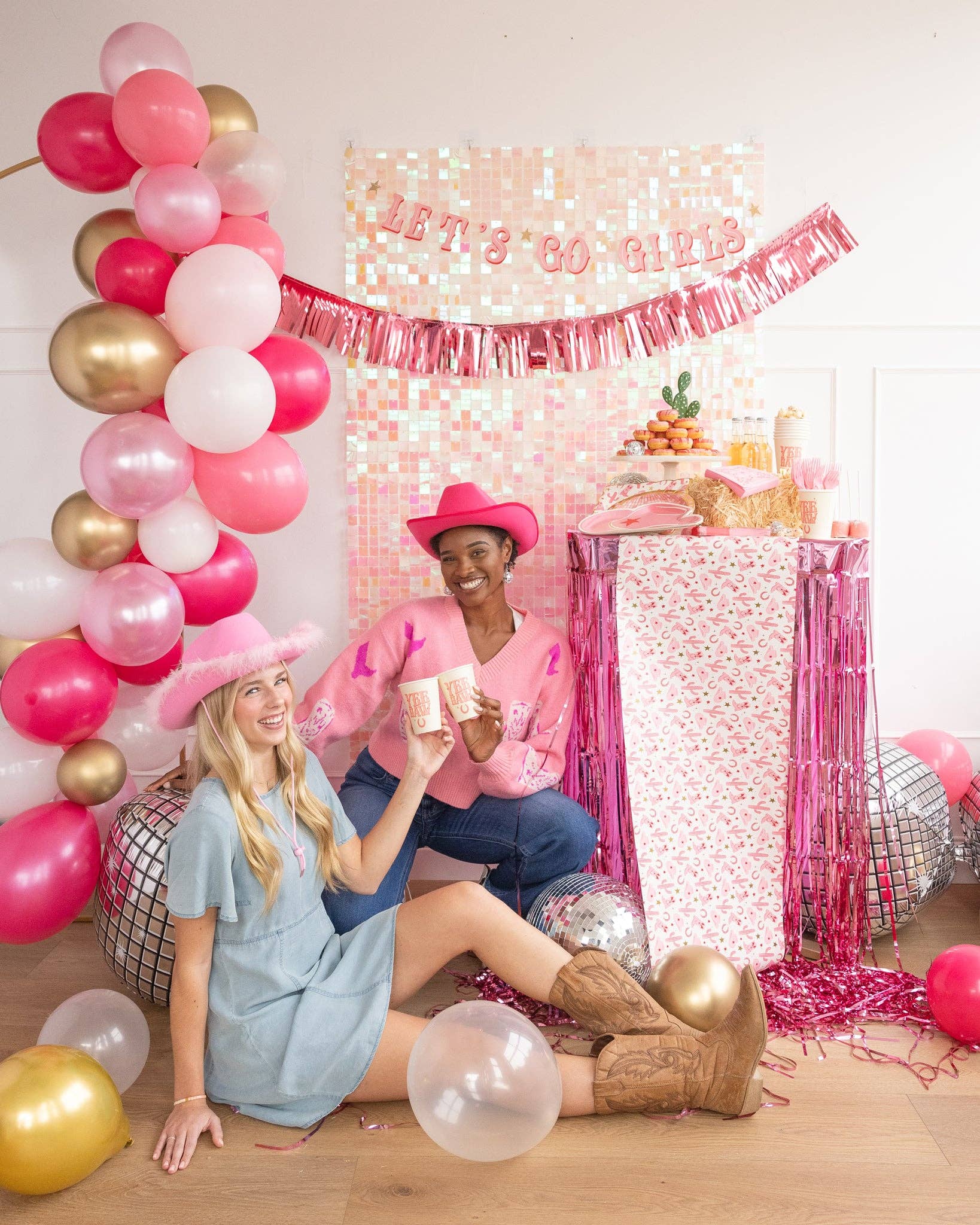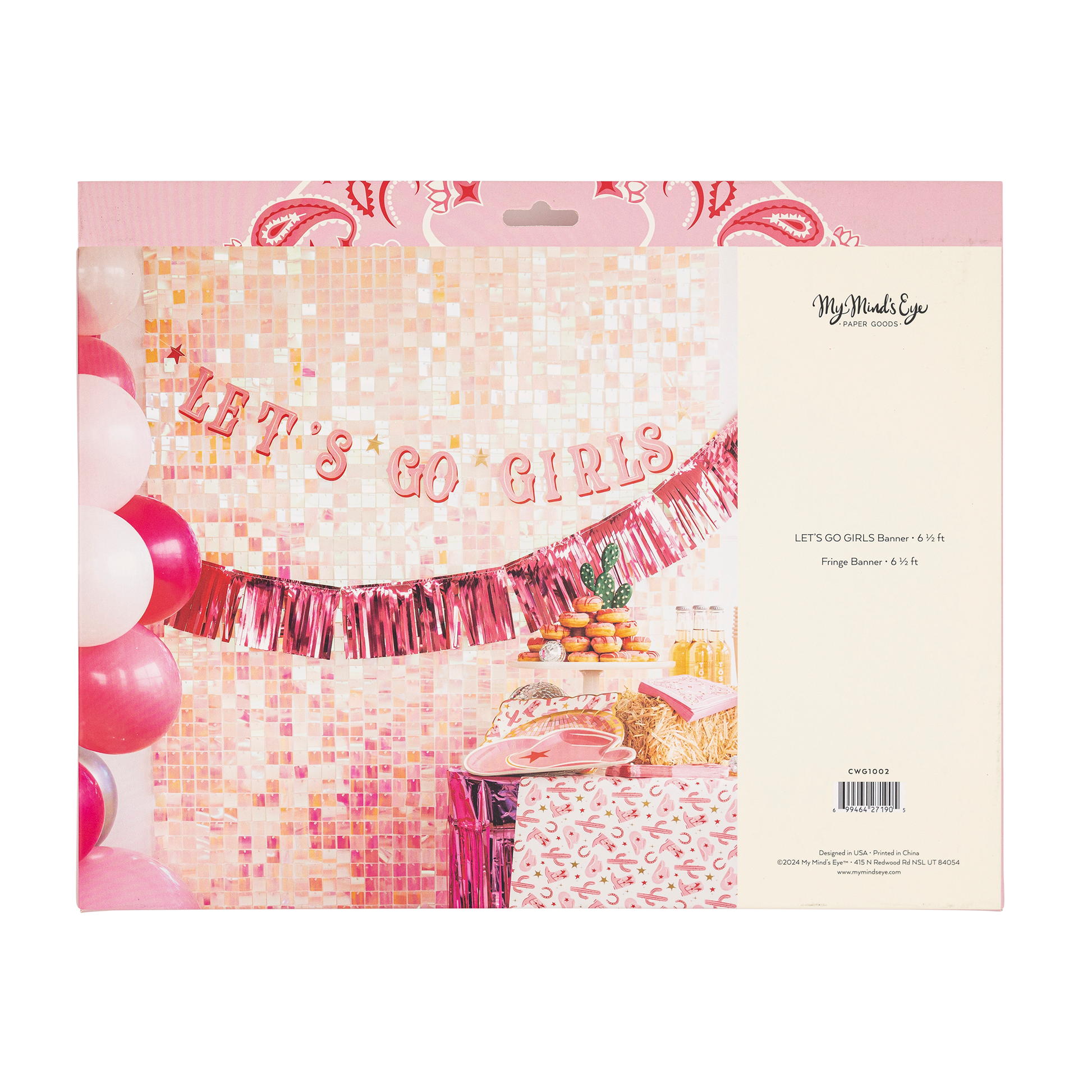 Get your groove on with our Let's Go Girls Banner Set! Featuring a fringe banner and a disco cowgirl banner, this set is perfect for adding some fun and flair to any party or event. So gather your girls and let's boogie all night long! • includes 2 banners • LET’S GO GIRLS Banner - 6 ½ ft • Mylar Fringe Banner - 6 ½ ft • gold foil