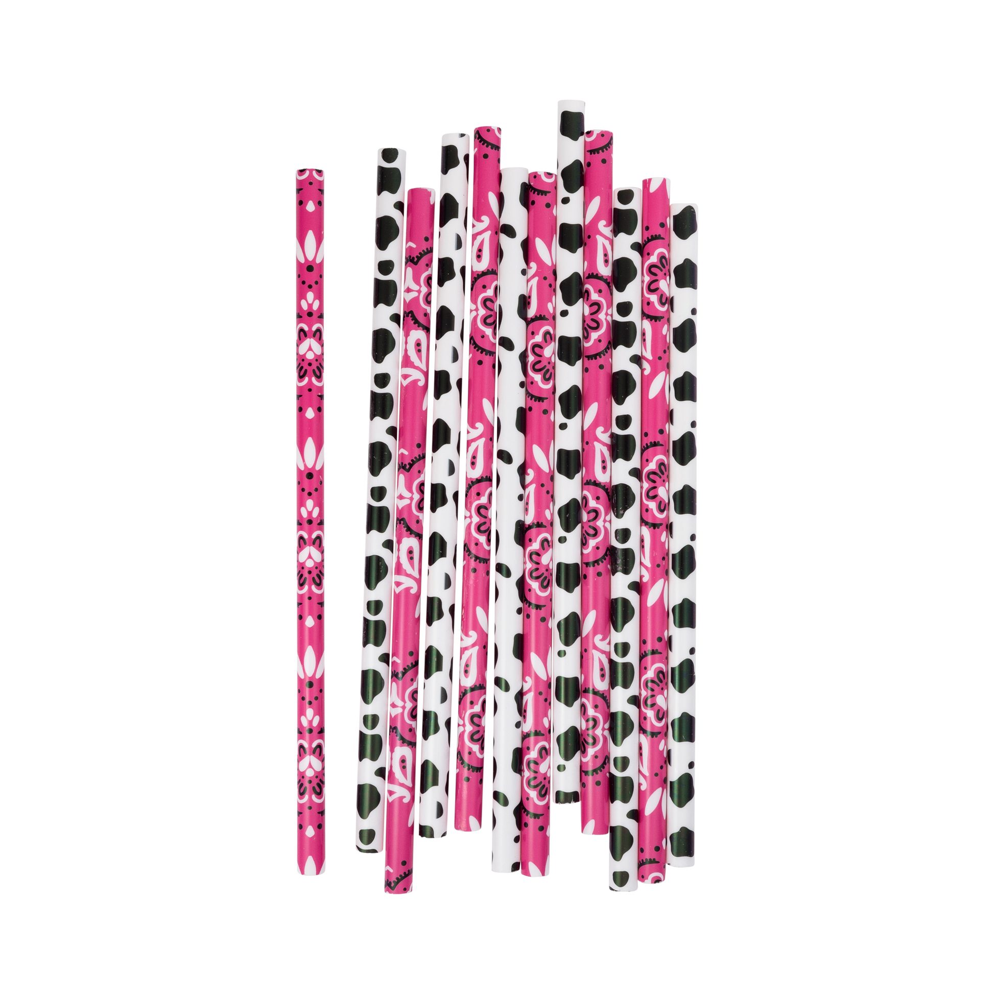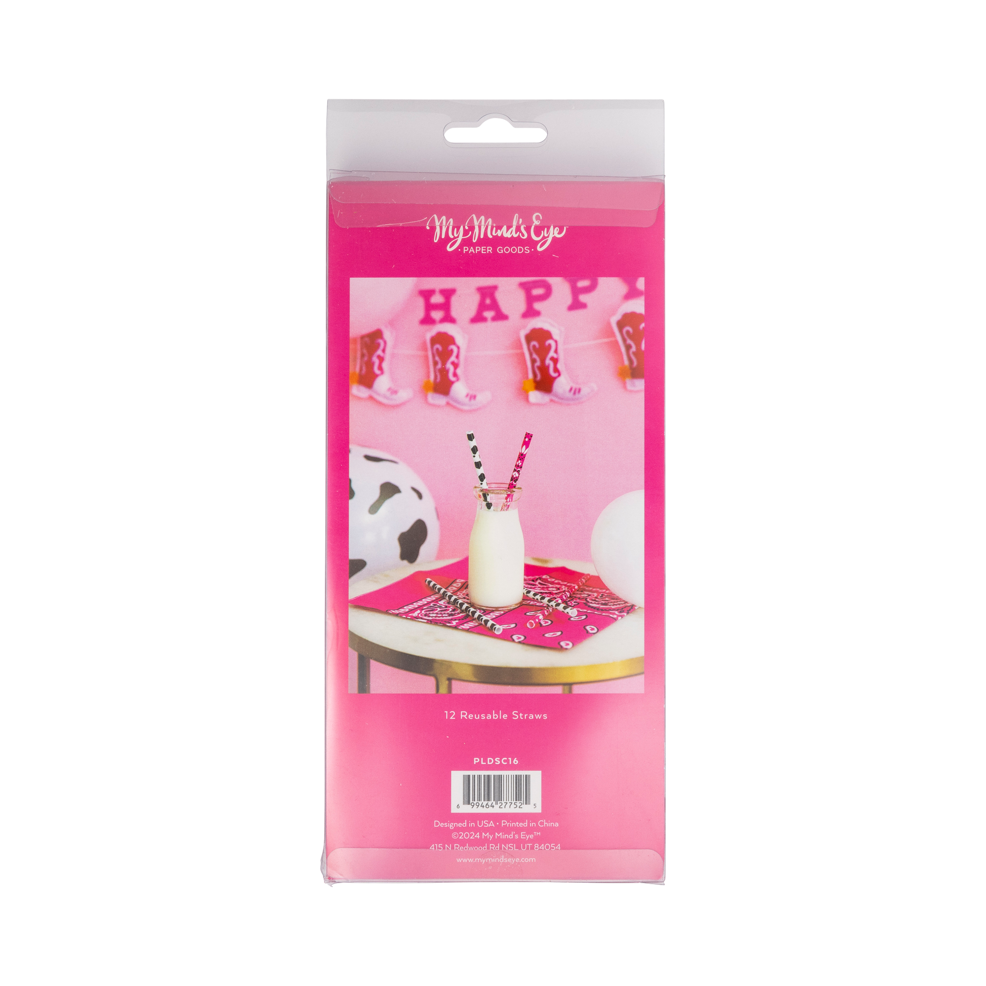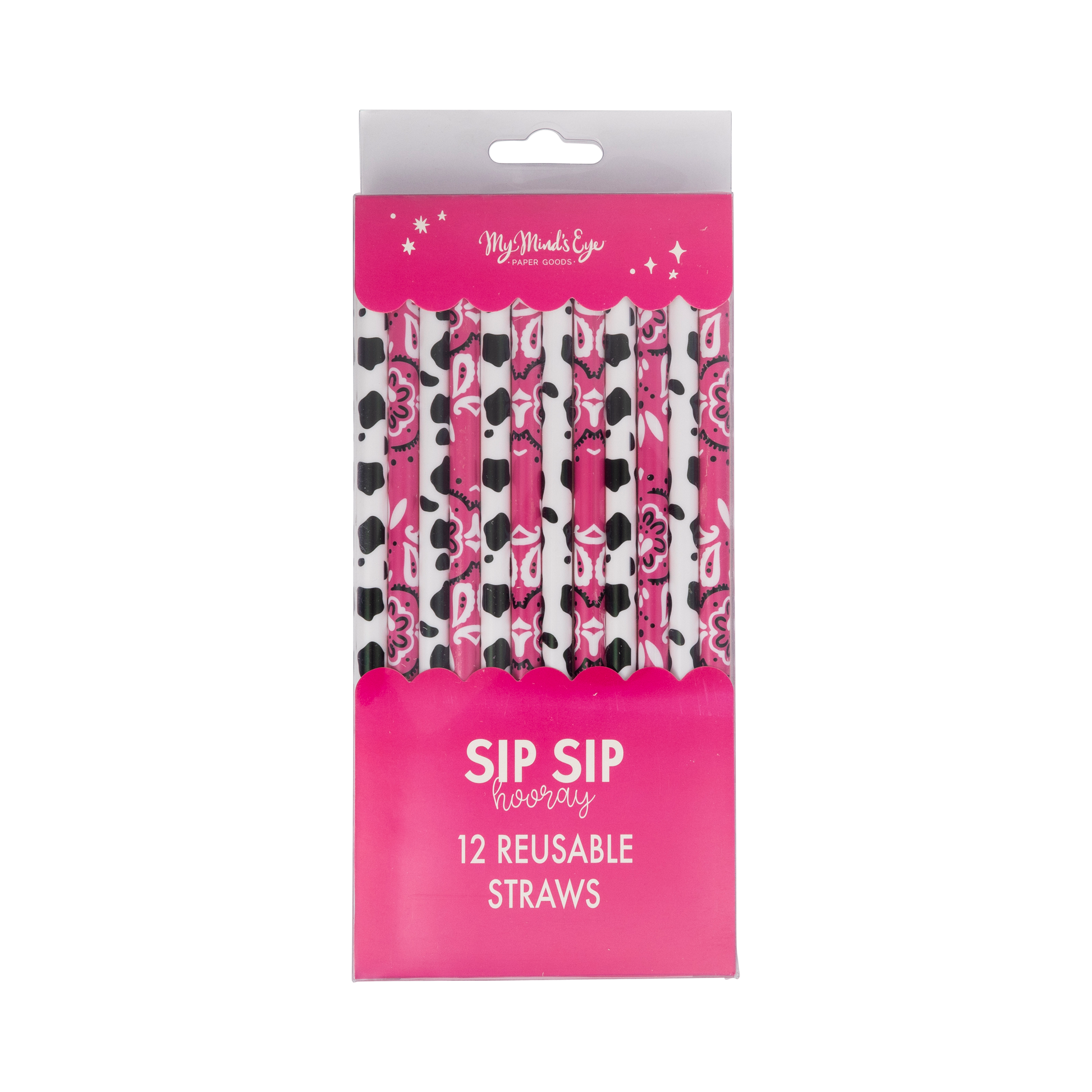 Say "Yee-haw!" to these pink cowgirl reusable straws. Saddle up and sip in style with these eco-friendly straws. Perfect for any cowgirl (or cowboy) looking to make a statement while reducing single-use plastic waste. • 12 Reusable Plastic Straws • 8" length x .33" diameter • 6 each of 2 designs