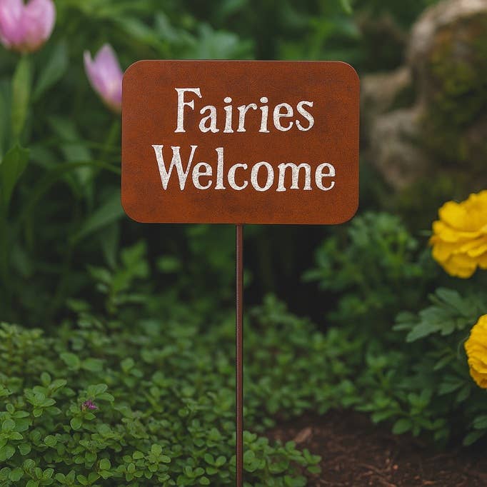 This Metal Sign Stake designed to evoke a weathered, magical vibe.