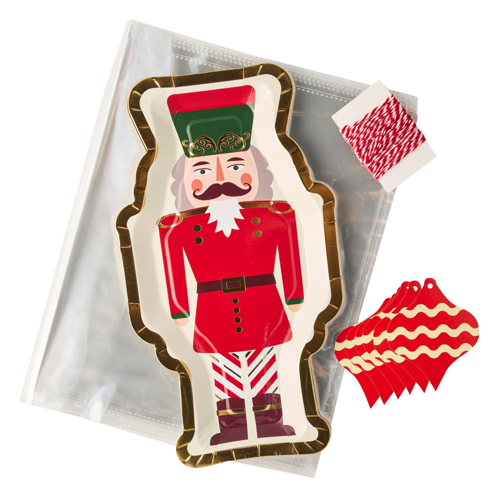This set includes six festive, die-cut trays shaped like Nutcracker perfect for presenting cookies, sweets, or small holiday treats. The Gifting Kit also contains 6 gift tags, 6 clear bags, and bakers twine for picture-perfect packaging!
