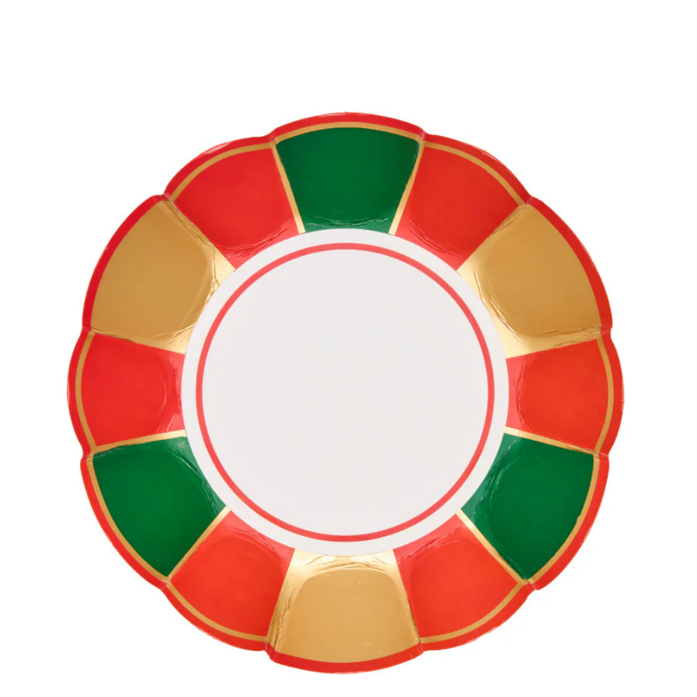 These scalloped-edge appetizer bowls from our Joyful Christmas collection feature alternating borders of red, green, and gold with a clean, solid white center. With their bold holiday colors and elegant foil accents, they’re perfect for bringing festive cheer and sophistication to your Christmas celebrations. These bowls are both durable and disposable, allowing you to skip the dirty dishes, without sacrificing quality and style. Your guests will never believe they’re disposable! • Quantity: 1 pack of 8 bowls. • Material: Paper • Size: 6.5" round. Perfect for appetizers, desserts, side dishes, & more!