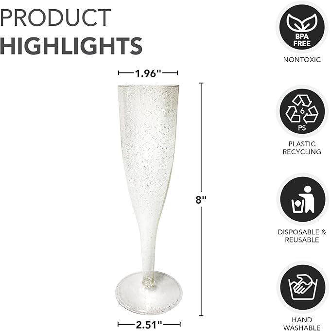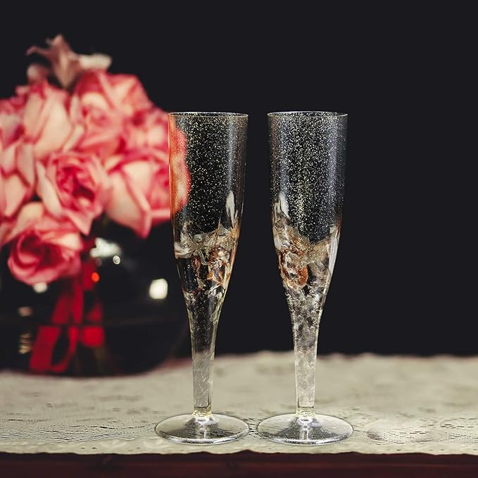 Elevate your next special occasion with our 5oz Gold Glitter Champagne Flutes. Made of sturdy plastic, these elegant and sparkly flutes add a touch of contemporary style to any event. Perfect for weddings, birthdays, or parties, these disposable flutes allow you to enjoy without the hassle of cleaning or the risk of broken glass.