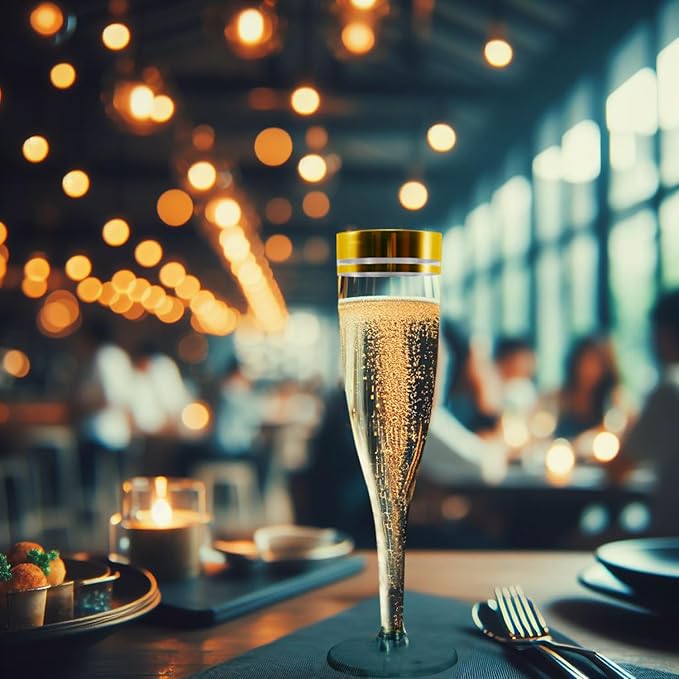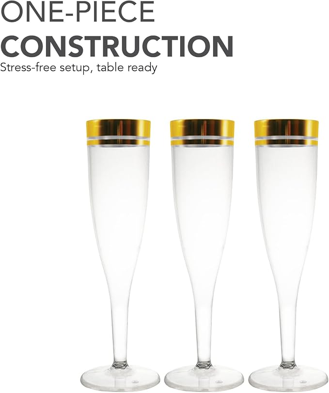Savor every moment with our 5oz Champagne Flutes. Made with a sleek 1-piece design, these clear plastic flutes with gold rim, bring an air of refinement to any event. And with disposable convenience, post-party cleanup is a breeze. Ideal for weddings, parties, receptions, and more. Cheers to a hassle-free celebration.