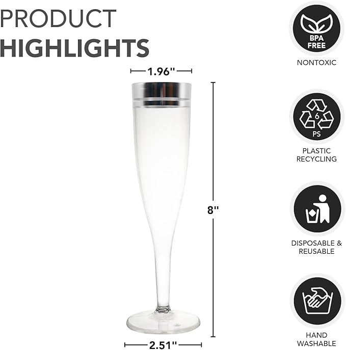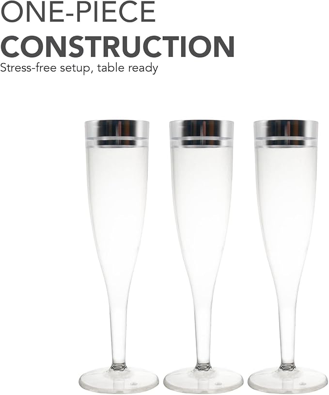 Savor every moment with our 5oz Champagne Flutes. Made with a sleek 1-piece design, these clear plastic flutes with silver rim, bring an air of refinement to any event. And with disposable convenience, post-party cleanup is a breeze. Ideal for weddings, parties, receptions, and more. Cheers to a hassle-free celebration.