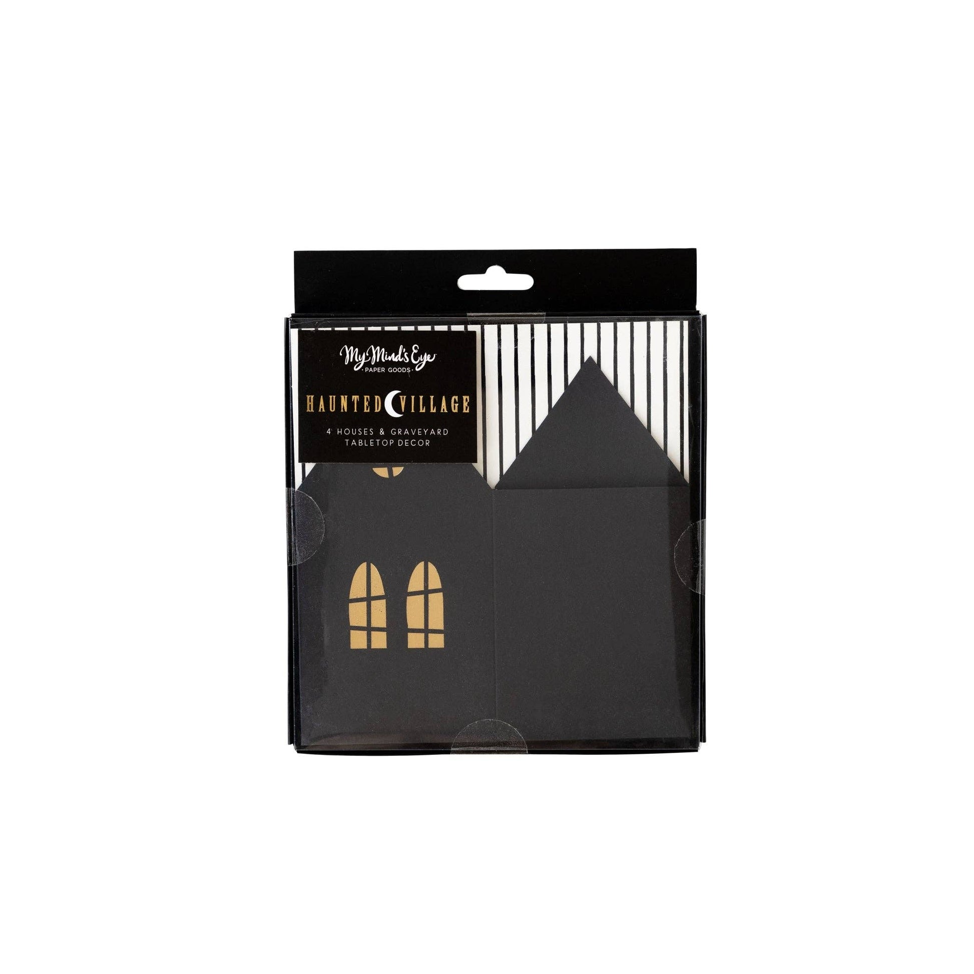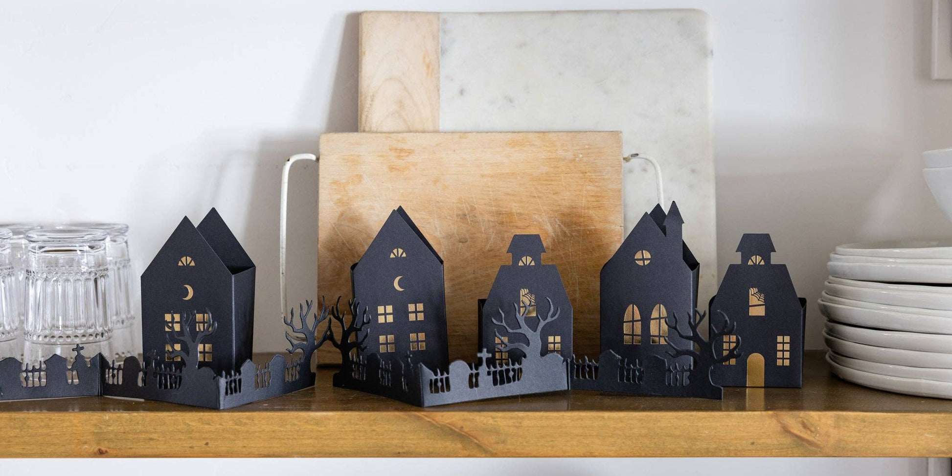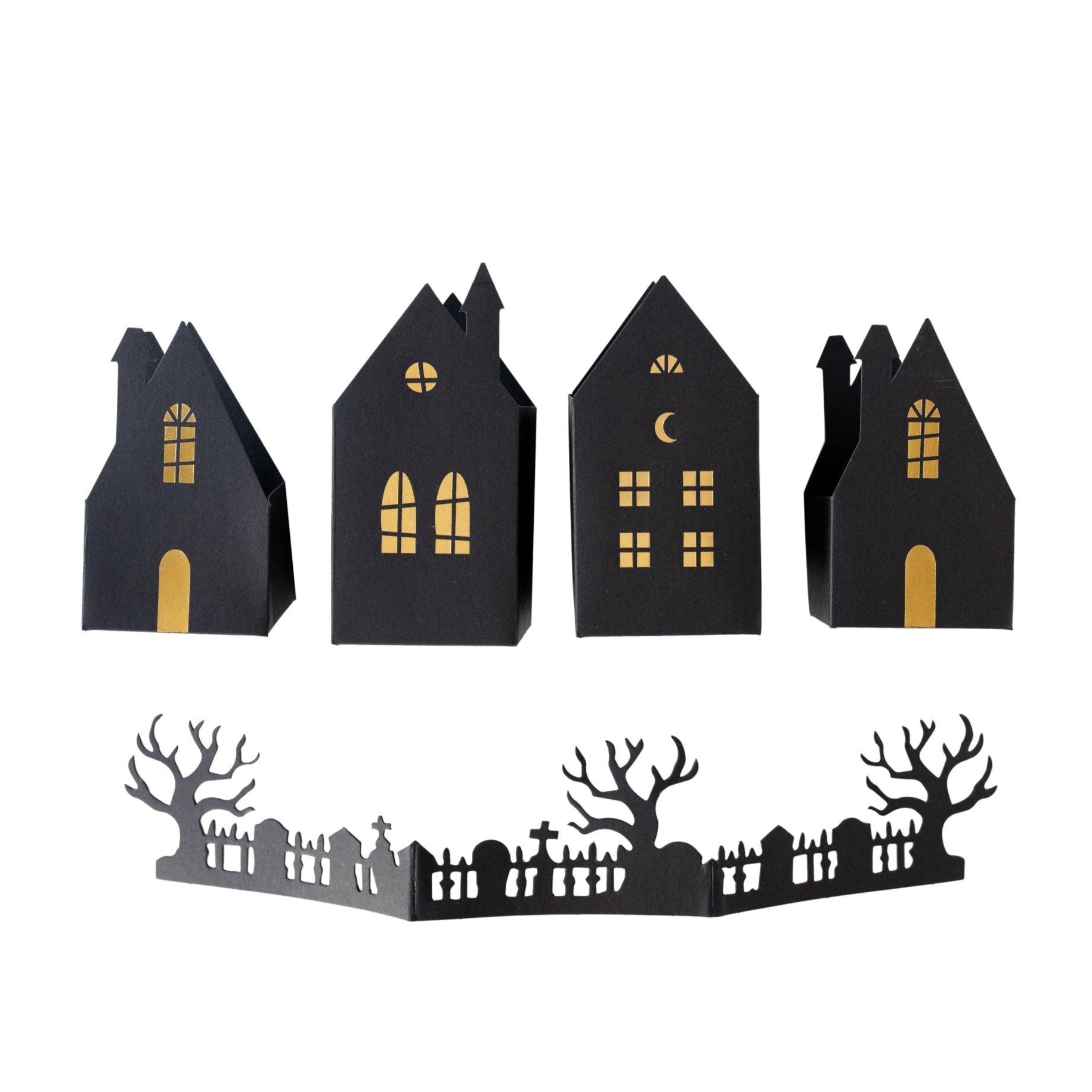 Easily create a terrifying tablescape with this haunted village. Featuring 4 dimensional houses with gold foil accents and a frightful fence, this decor set will make a spooktacular scene on a table or countertop that you and your favorite ghouls can enjoy all October long.