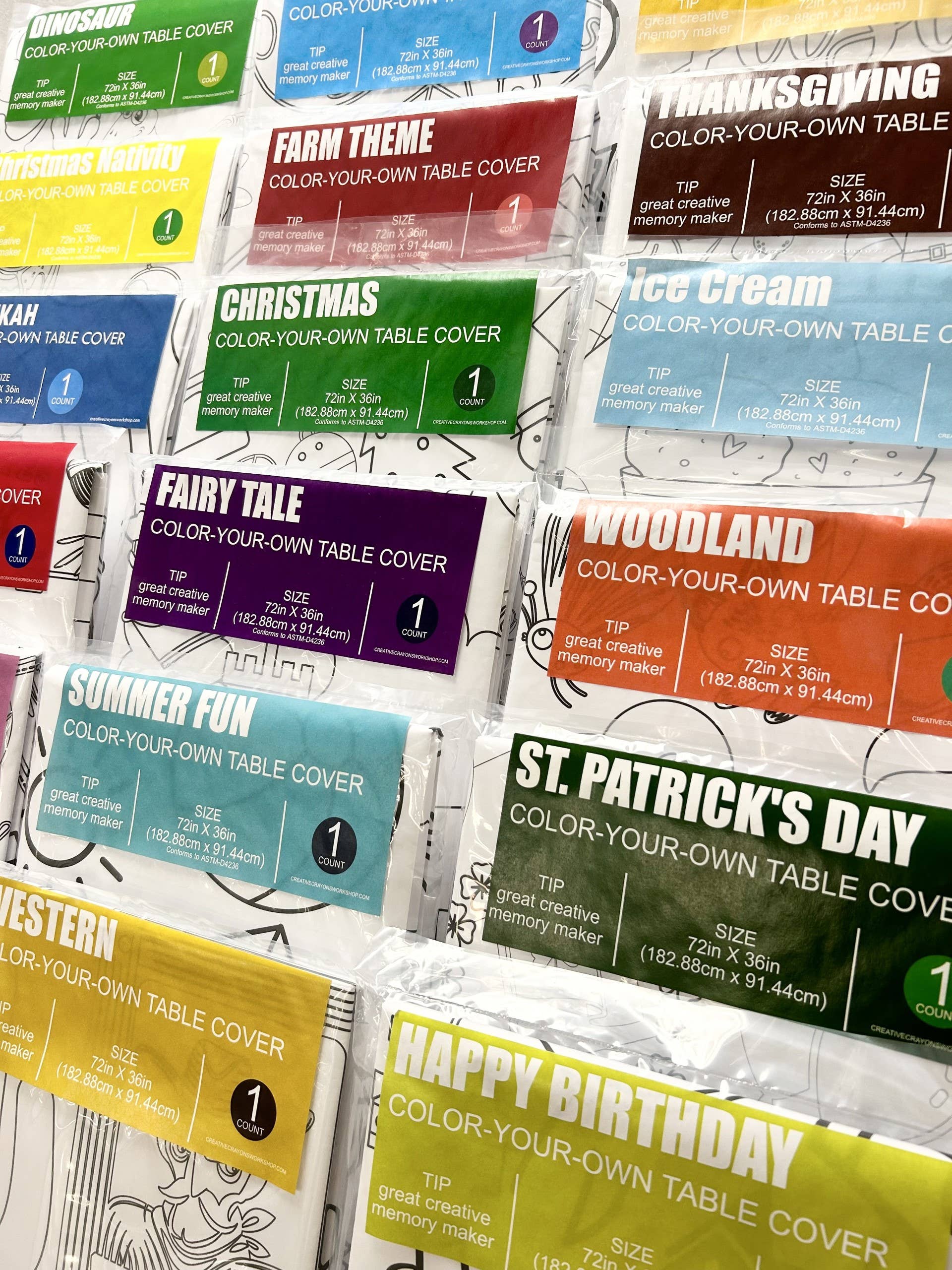 Each exclusively designed paper table cover arrives folded in a 10x14 inch clear package for easy, space-saving storage. Simply spread across your dining table or floor to have hours of coloring fun!