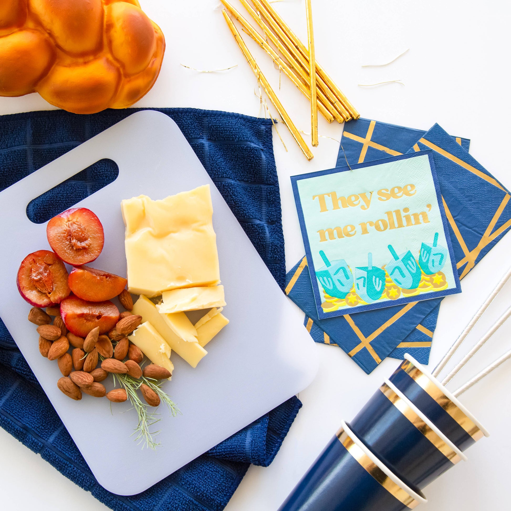 A part of the Jollity & Co Happy Challah-Days Collection, these cocktail napkins are decorated with dreidels rollin' Use them for Bar Mitzvah, birthdays, weddings, and more.