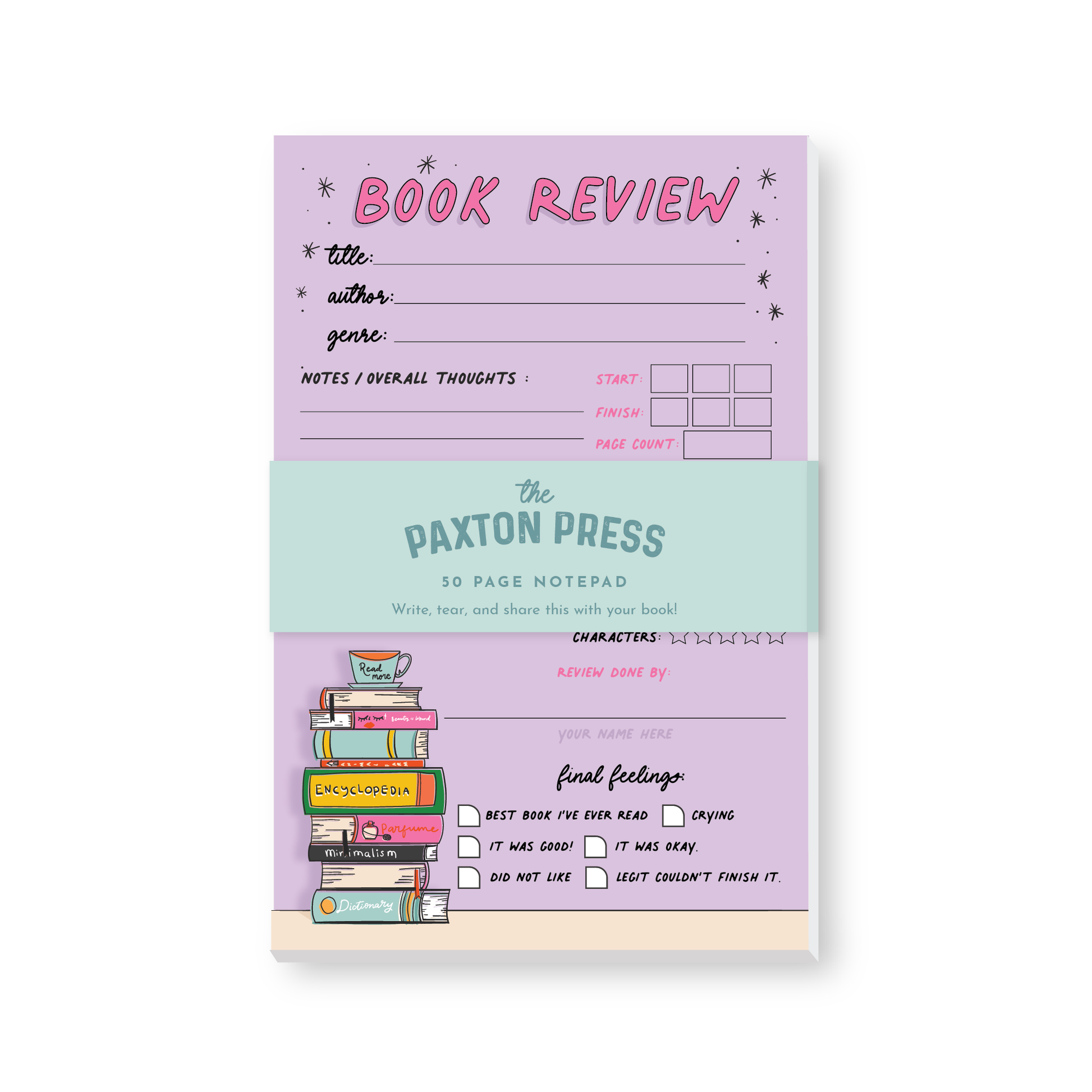 Introducing the Book Review Notepad - the perfect companion for book lovers! With a cute design featuring a stack of books and coffee, this 5.5" x 8.5" notepad has 50 pages with spaces for title, author, genre, notes & overall thoughts, star rating, and recommendations. Ideal for including a page when loaning books to friends!