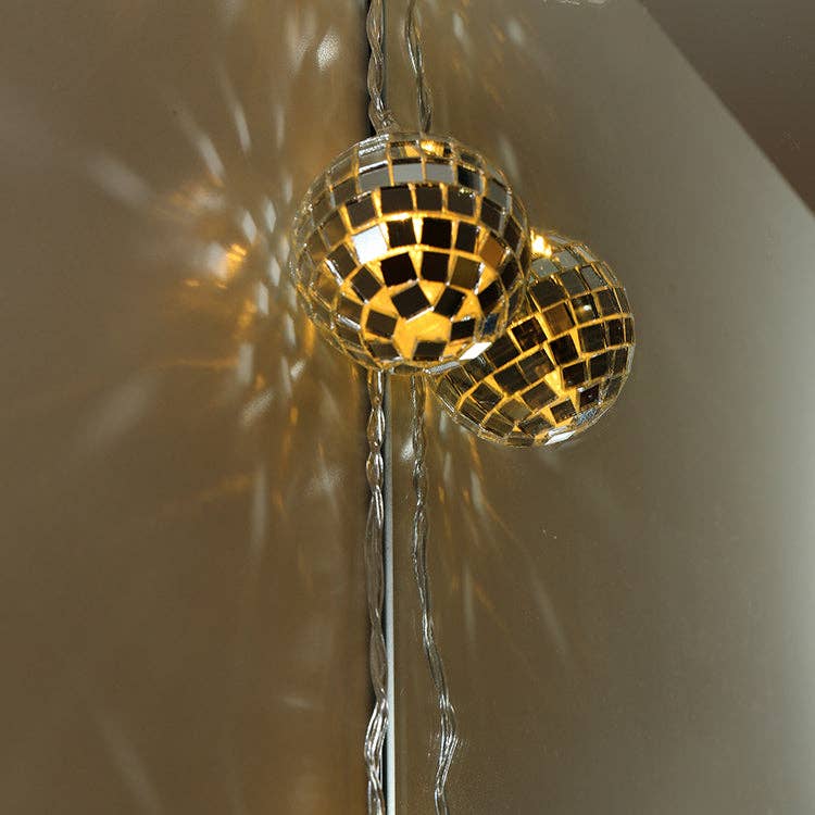 Illuminate your surroundings with our Disco String Lights. This product features 10 LED lights, each encased in a miniature disco ball. Battery-operated for convenience and versatility, these string lights can be easily arranged to suit your decor needs.