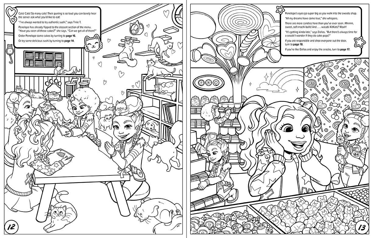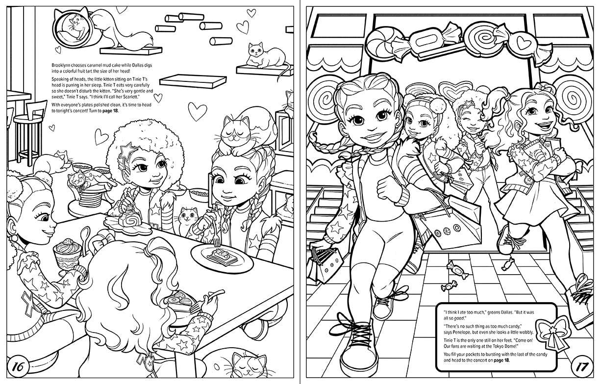 This is your XOMG POP! adventure, your way! You’ll make big decisions about where and how the band performs, what adventures they go on, and how you’ll show the world what you’re all about. Outfits, dances, set pieces—it’s all in your hands, so turn up the volume and get ready to color the best world tour ever!