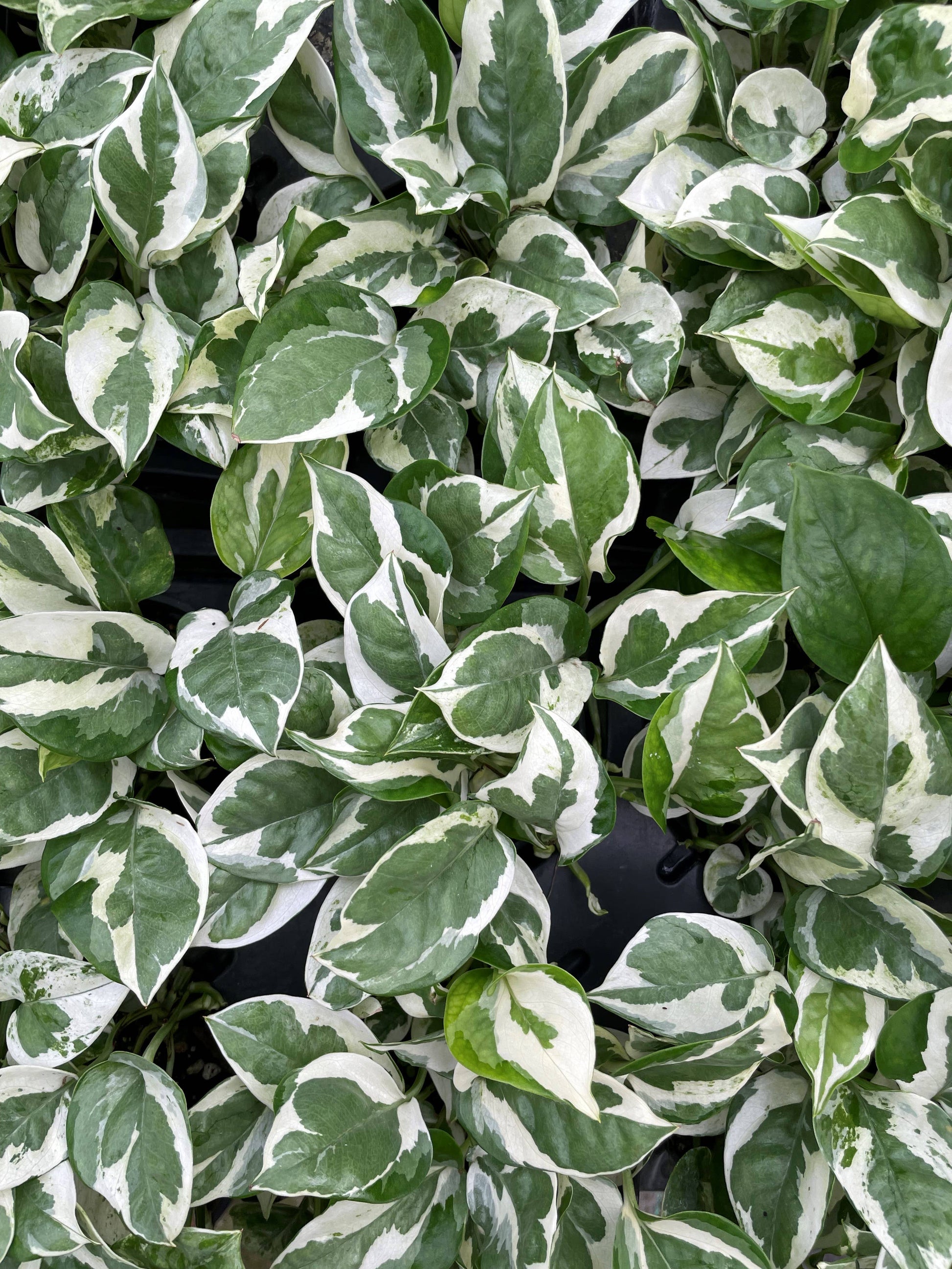 Pearls and Jade Pothos is an exotic pothos variety, perfect for enlivening a home! This variety features highly variegated white and green leaves which grow in a vining habit. Be sure to maintain enough light for this plant to continue to produce the bright white variegations. Botanical Name: Epipremnum aureum. Thrives in medium to indirect bright sunlight. This plant will arrive in a plastic growers pot with drainage holes. Pot color may vary. Available in 3" or 4" pot size. Decorative pots not included.