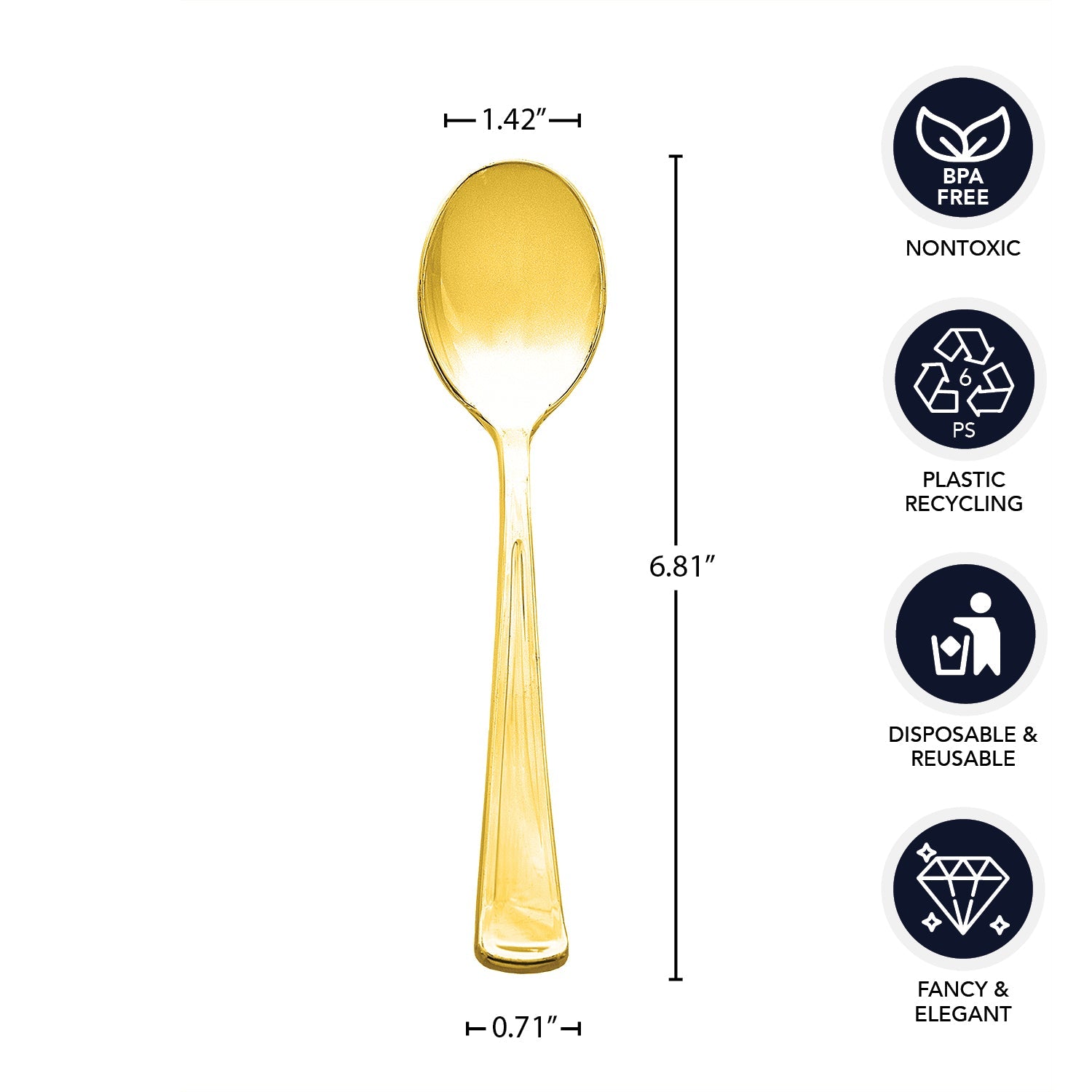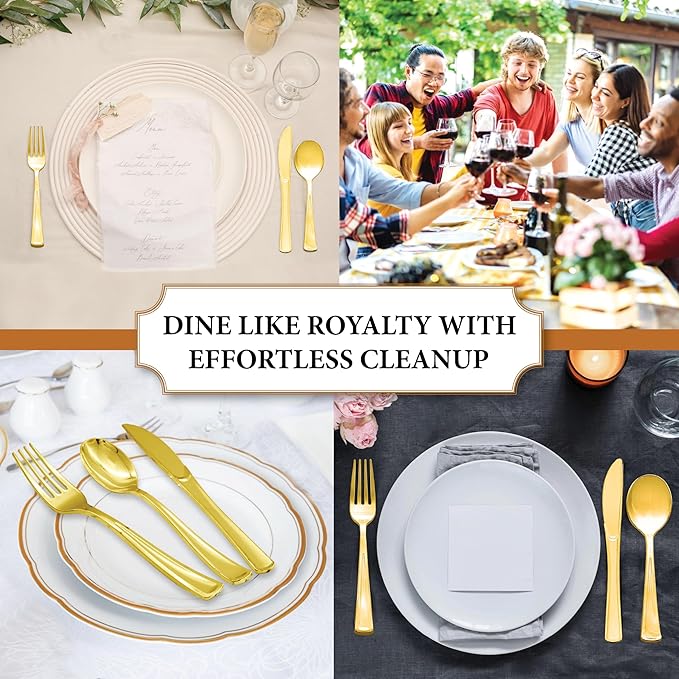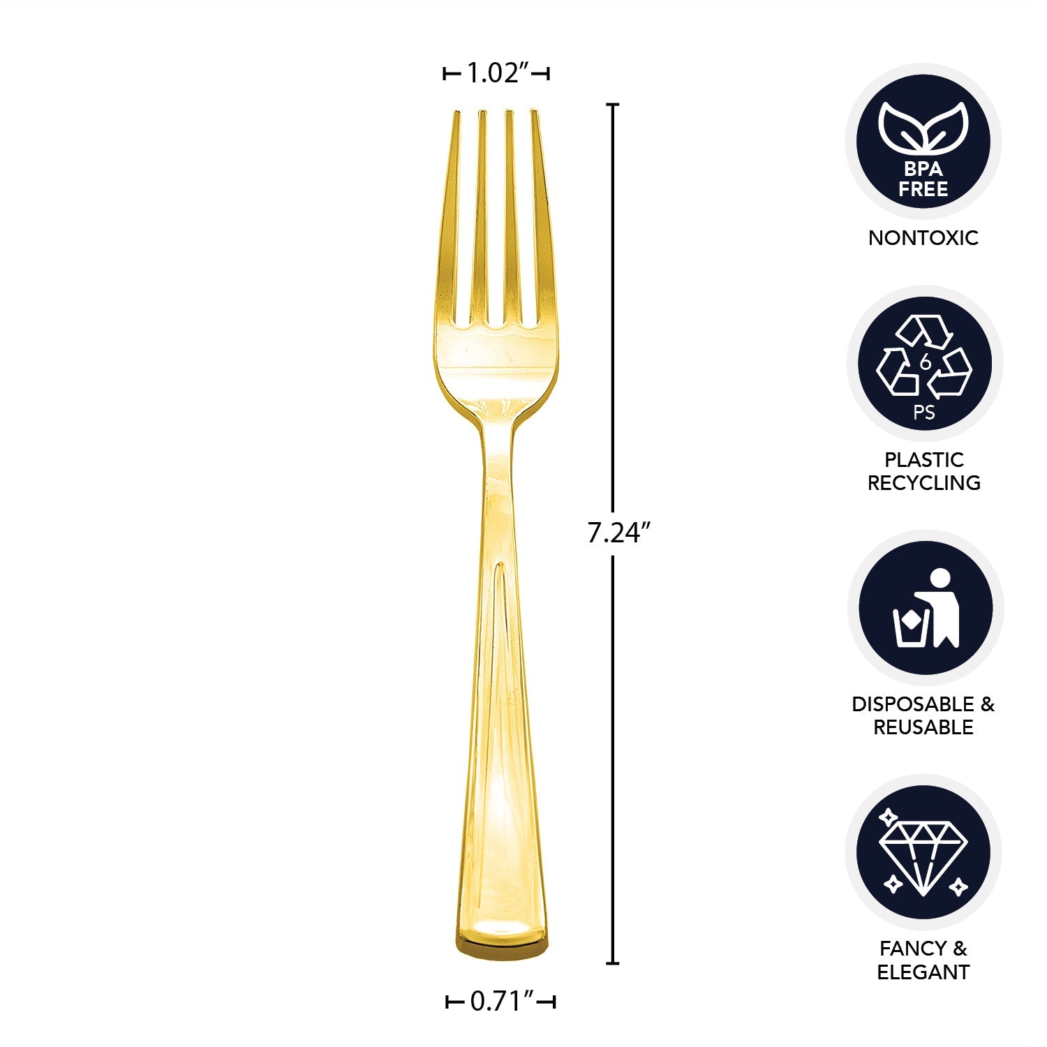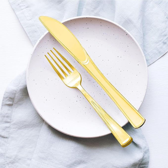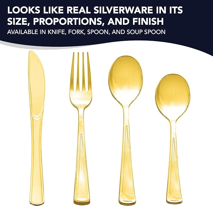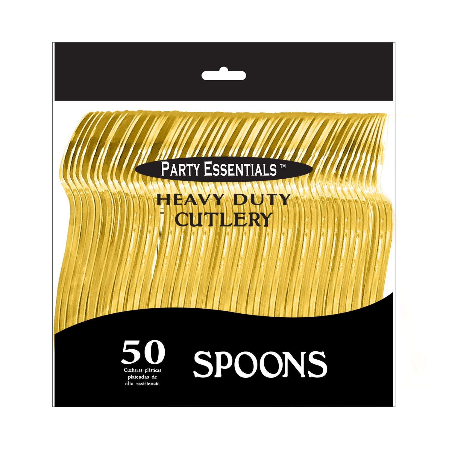 Upgrade your meal presentation with Party Essentials' Gold Metallic Plastic Cutlery. This 50-piece set features high-quality disposable forks, spoons, and knives, adding elegance to any occasion. Perfect for small gatherings, weddings, and more. Versatile and stylish, it's the perfect choice for all your dining needs.