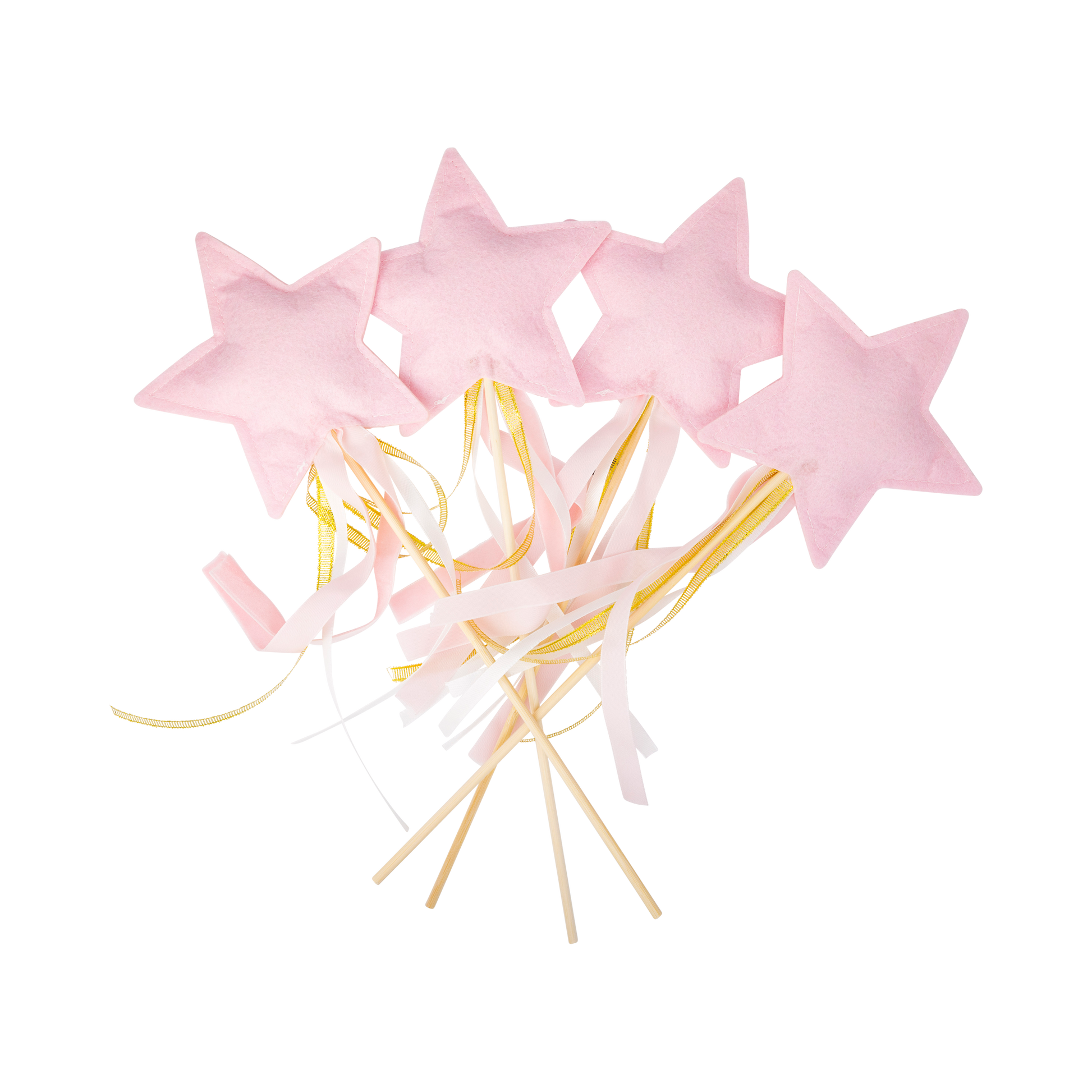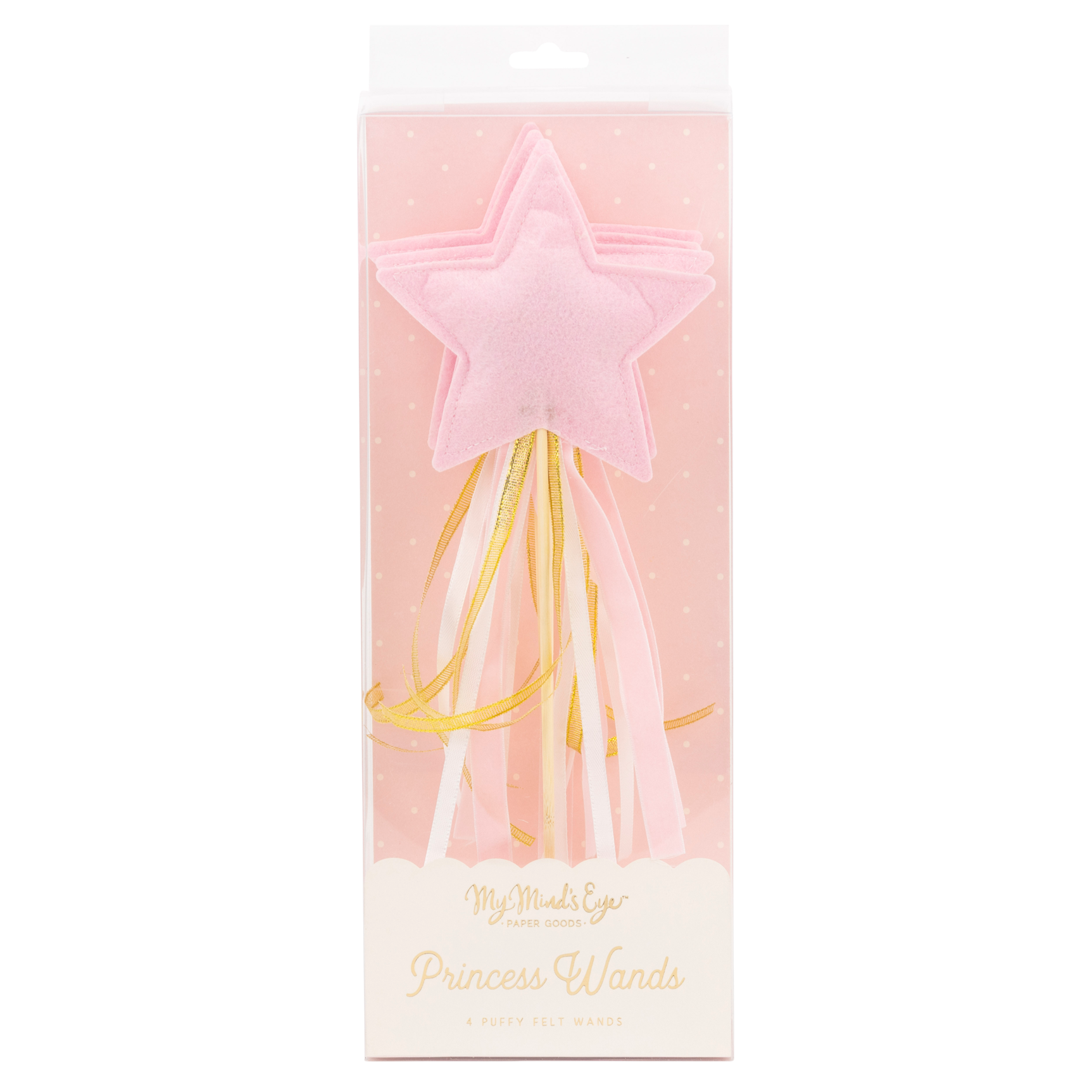 Transform any party into a magical kingdom with this Princess Puffy Felt Wand Set! Featuring puffy felt wands fit for royalty, this set is perfect for any princess-themed celebration. Give your guests the gift of enchantment and let their imaginations run wild! • Set of 4 puffy felt star wands attached to 10" dowel • Star is 5" x 4" • ribbon accents.