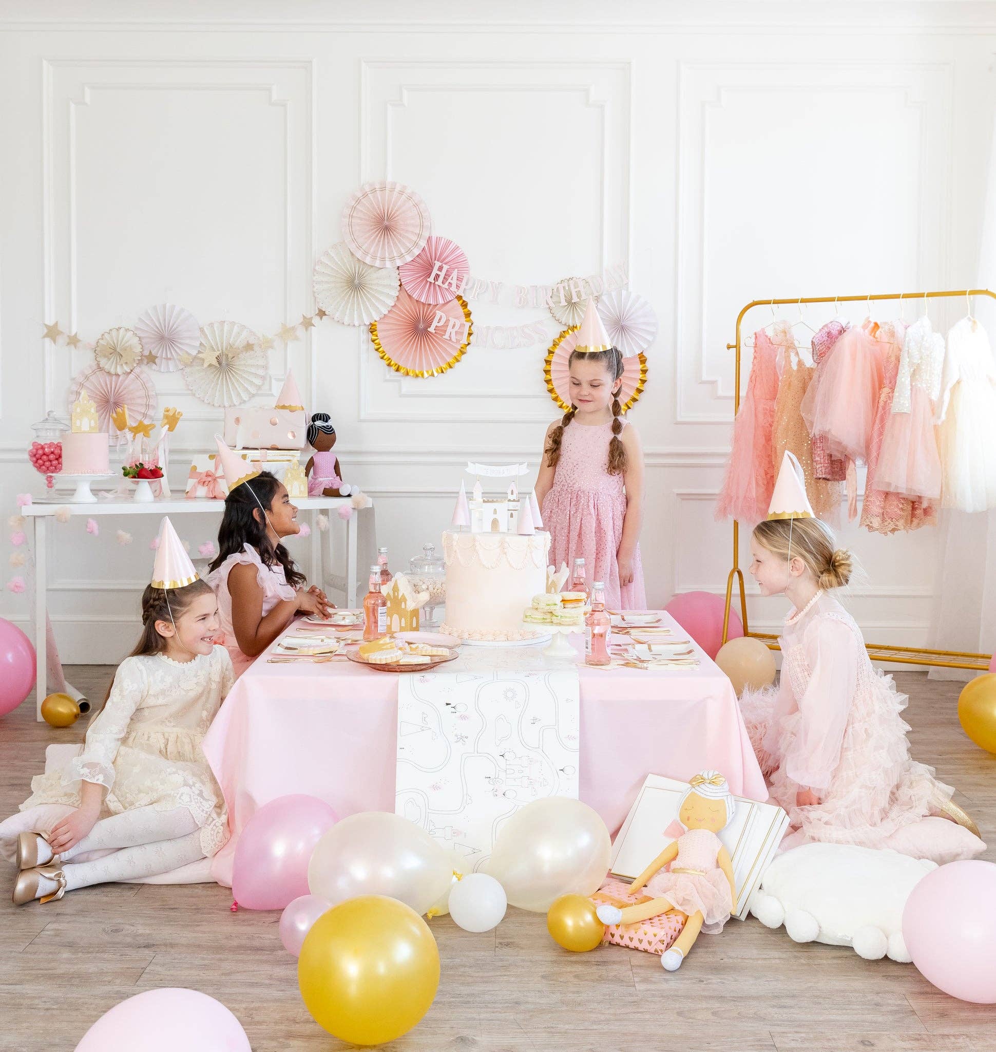 Create the perfect fairy tale day with our princess party fans! Designed with soft pinks and creams and gold foil accents these party fans will turn any space into a whimsical kingdom for your princess and her friends. This set of six party fans create a sweet party atmosphere for any birthday party, tea party or baby shower that calls for a soft color palette with a touch of gold shimmer. • Includes 6 paper fans • 1 - 17", 2 -14", 2 - 11" and 1 - 8" fan • Double-sided • Glitter and gold foil accents