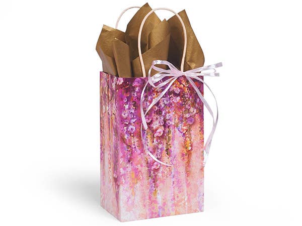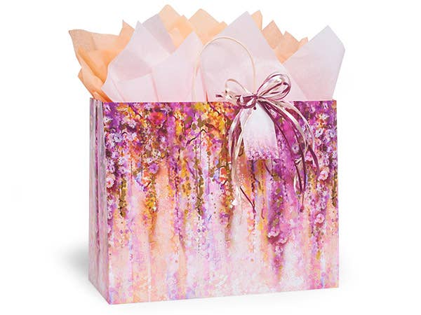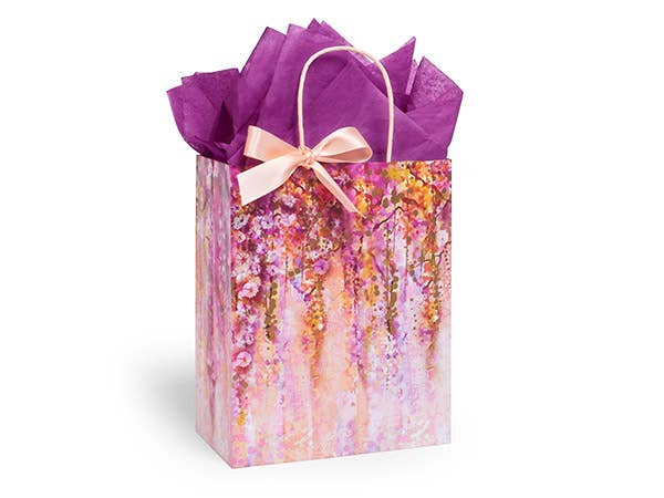 Wisteria Wishes paper gift bags feature a lavish Wisteria dreamscape in shades of plum, blush and peach with highlights of gold. Floral design is printed on white gloss paper and have peach tinted paper twist handles. Floral gift bags are made from 40% recycled, 110 gsm, white gloss paper. Gift bags are 100% recyclable and contain minimum 40% PCW content and carry the Green Way ® logo. Vogue. Beautiful design for Mother's Day, birthdays, spring and boutique packaging.
