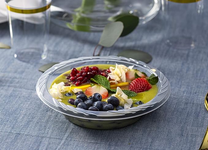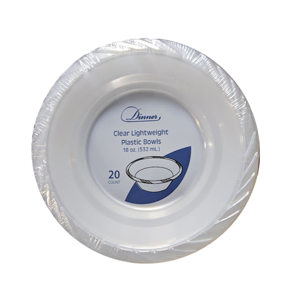 These 18oz clear plastic bowls come in a convenient pack of 20. Made of durable plastic material, they are perfect for any event or gathering. Their size makes them ideal for serving snacks, desserts, or soup. Save time on clean up and enjoy the convenience of disposable bowls.