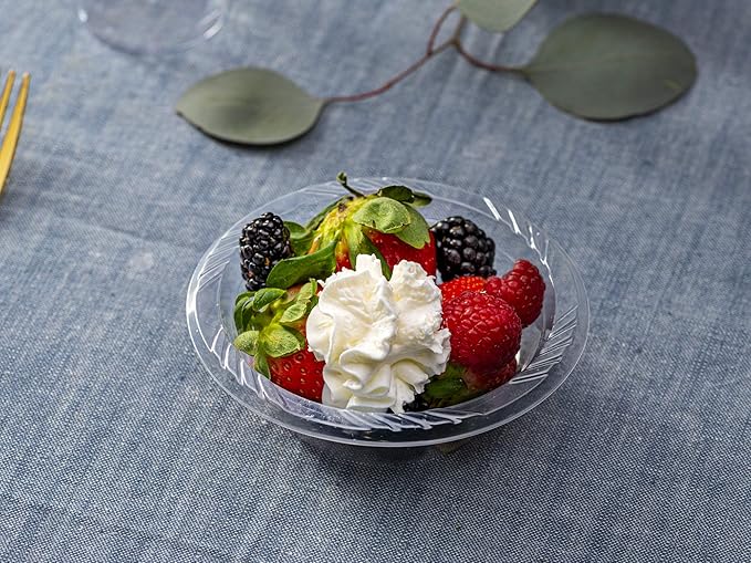 These 5oz clear plastic bowls come in a convenient pack of 40. Made of durable plastic material, they are perfect for any event or gathering. Their size makes them ideal for serving snacks, desserts, or sides. Save time on clean up and enjoy the convenience of disposable bowls.