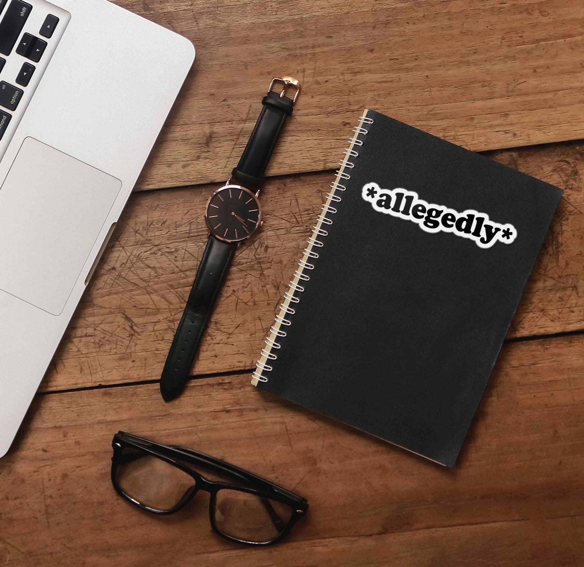 Allegedly sticker, mini 4" tumbler & laptop decal size. Durable die-cut vinyl decal with a matte UV-resistant coating. Waterproof & weatherproof for indoor & outdoor use. Made in USA. Perfect impulse buy item for boutiques, novelty gift shops, coffee shops, & bookstores. Get ahead of the story with this black & white quote sticker. It's a great gift for friends, coworkers, true crime readers, or Letterkenny fans. Perfect waterproof decal for Hydroflask water bottles, Yeti coolers, drink tumblers, wine glasses, mugs, & thermoses. Funny millennial internet humor decal for laptop, iPad, phone, Kindle or journal. Designed & Printed in North Texas.