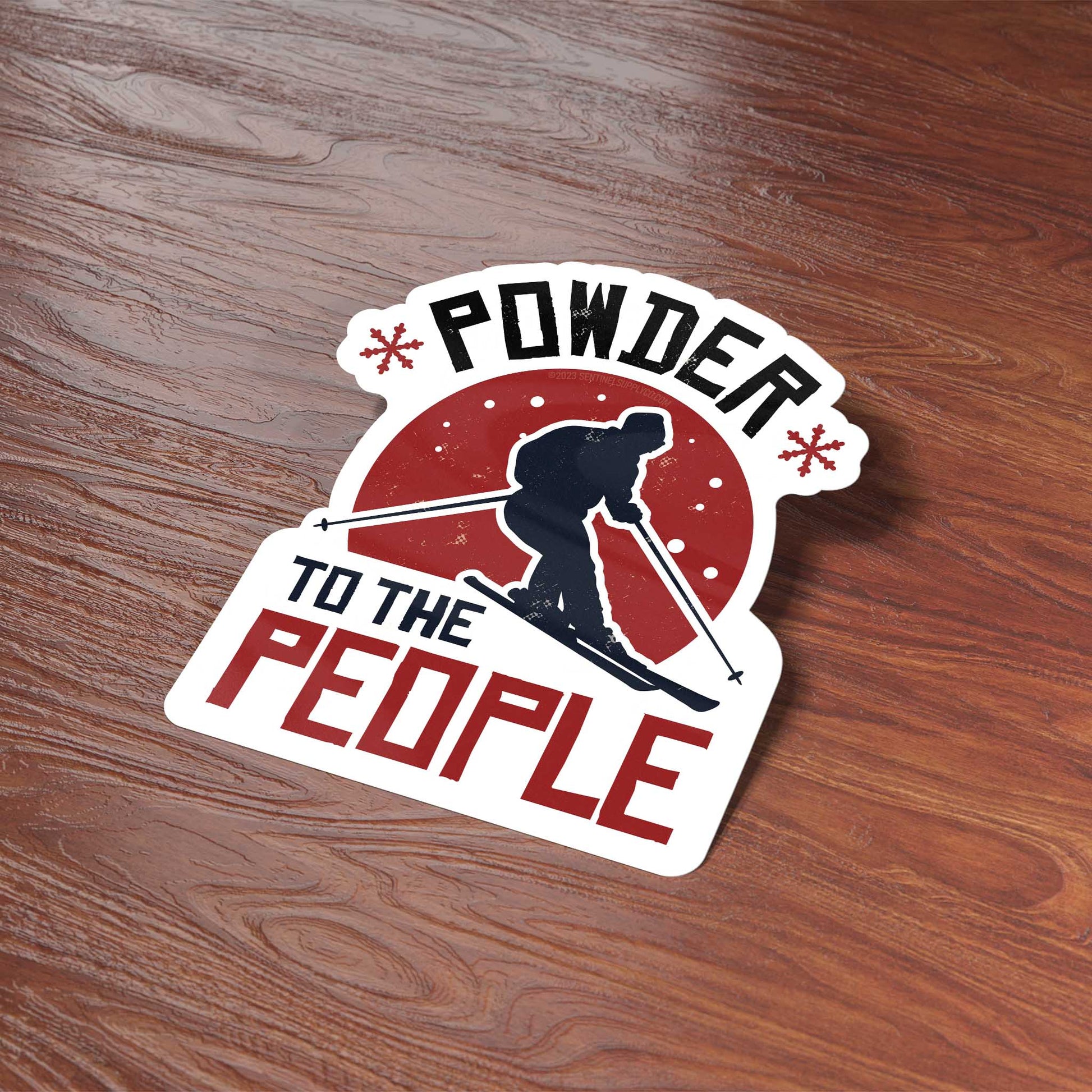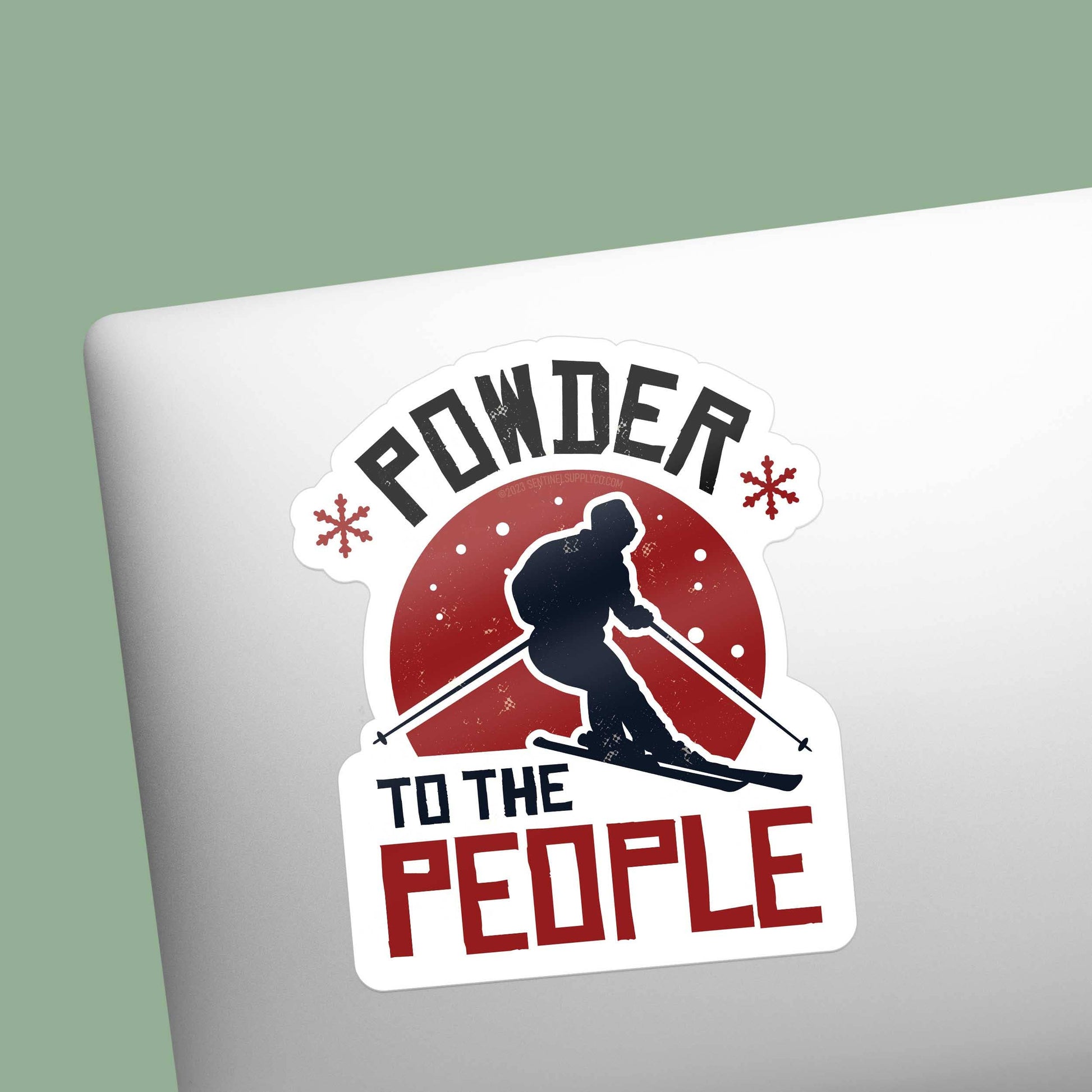 Powder to the People funny skier bumper sticker, 4.25" high. Durable die-cut vinyl decal with matte UV-resistant coating. Waterproof & weatherproof for indoor & outdoor use. Made in USA.