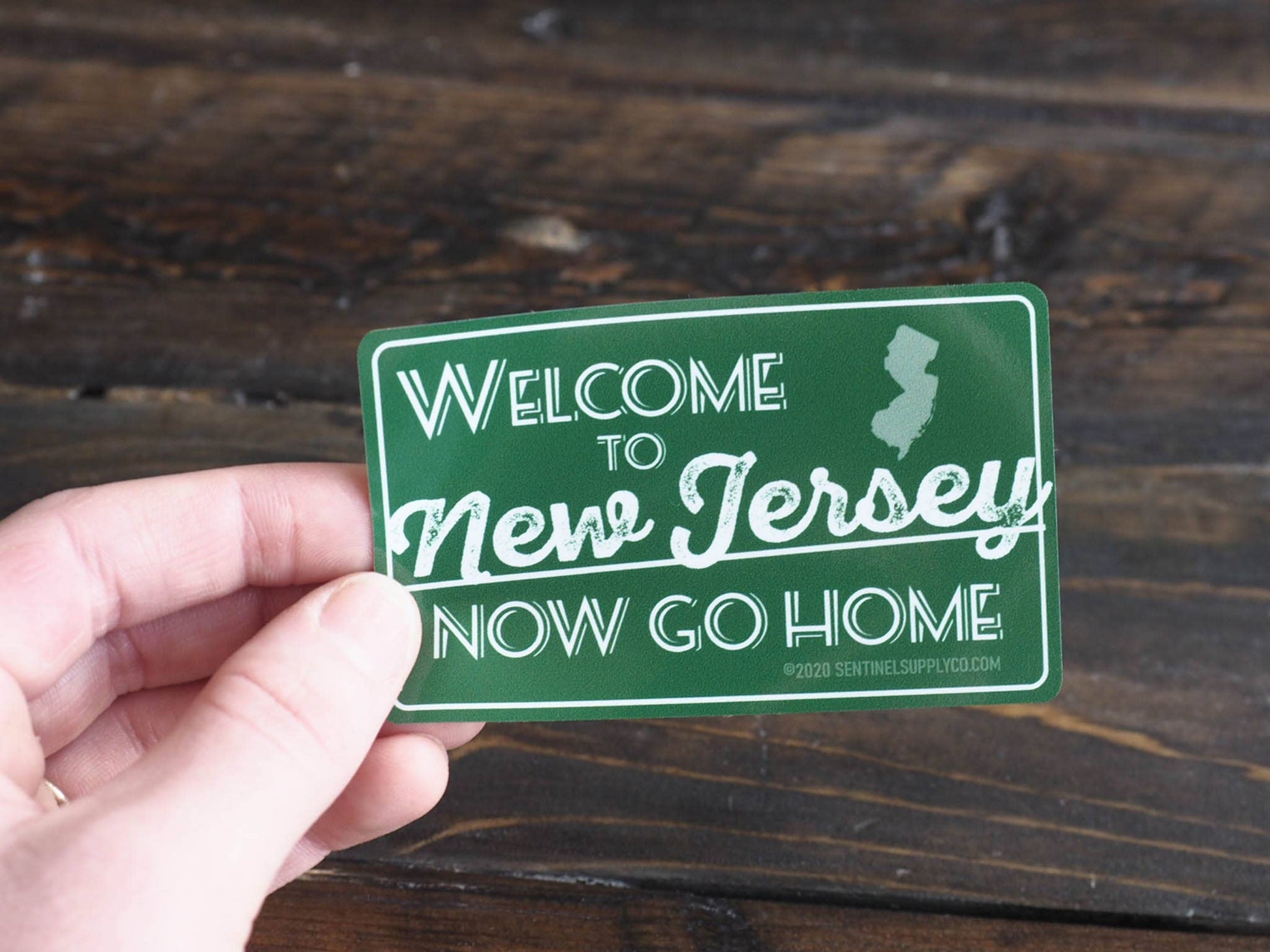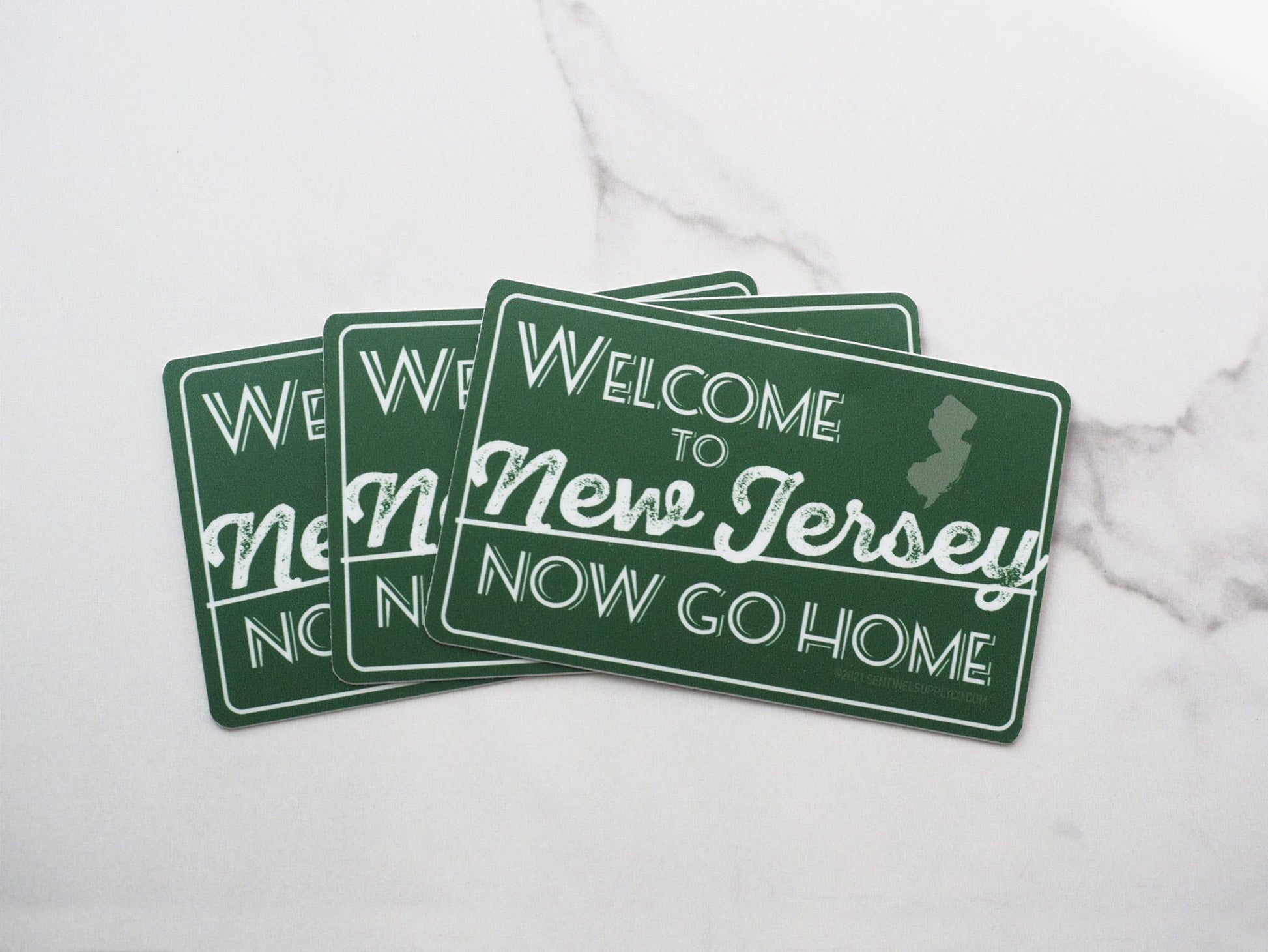 Welcome to New Jersey, Now Go Home! Whether you're a New Jersey visitor or a NJ native, you probably know it's not the most welcoming state, but it definitely has a lot of heart. Wear your Jersey crankiness with pride! This green NJ Turnpike road sign decal is a perfect souvenir whether you're a lifelong resident, recent transplant, or just visiting the Jersey shore. Perfect waterproof vinyl decal for Hydroflask, thermos, or beach cooler.