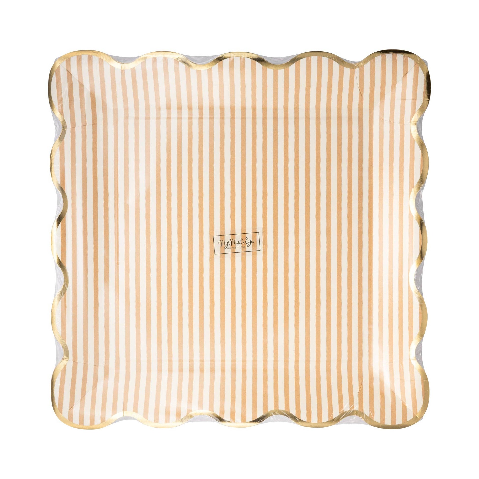 Celebrate your next baby shower with these Tan Striped 10" Plates, designed to perfectly complement neutral and coordinated party themes. Their subtle tan stripes add a stylish yet understated touch, making them ideal for serving appetizers, desserts, or main dishes. • includes 8 shaped paper plates • 10" x 10" inches