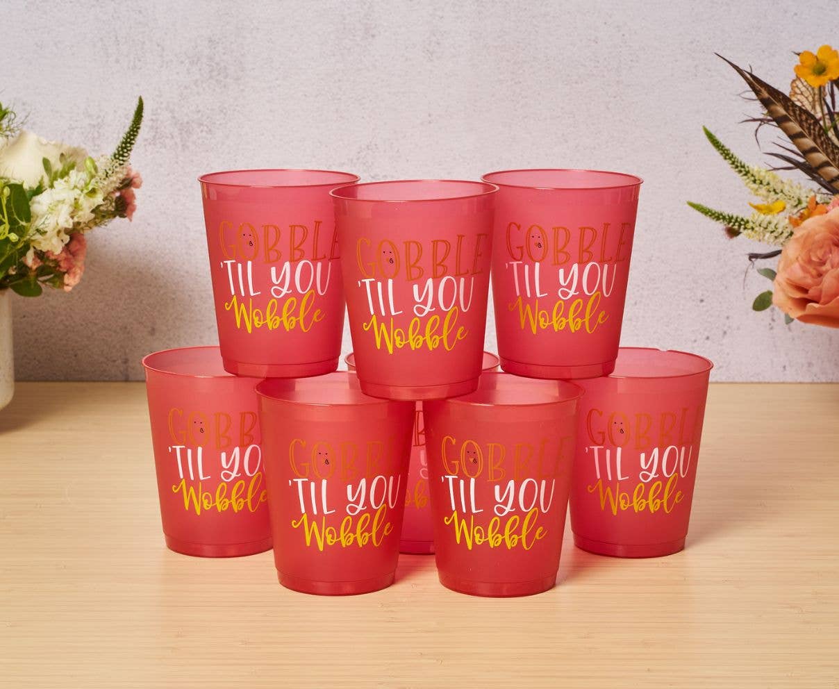 Each cup features playful, colorful lettering that reads “Gobble Till You Wobble” — perfect for adding a touch of humor to your Thanksgiving feast or fall festivities.