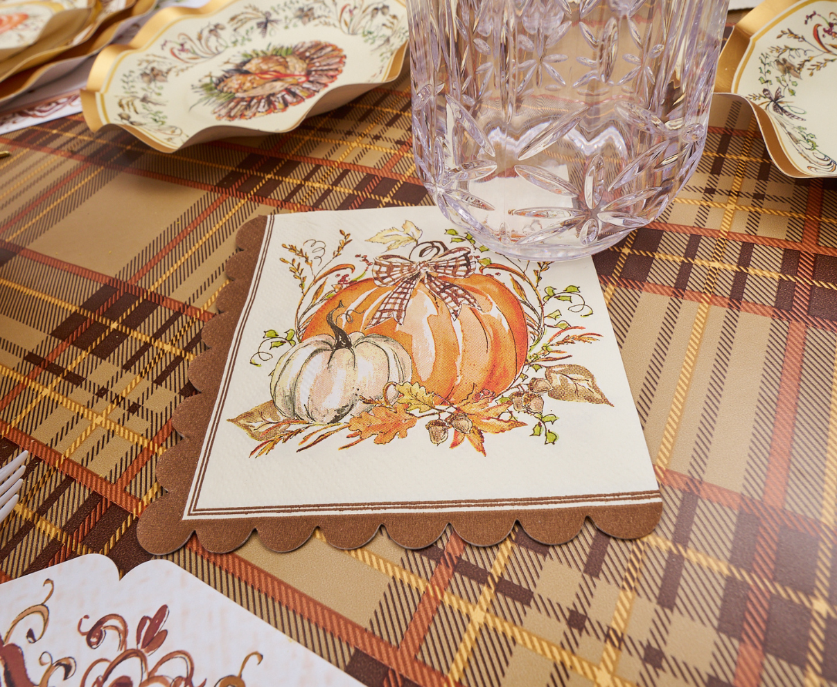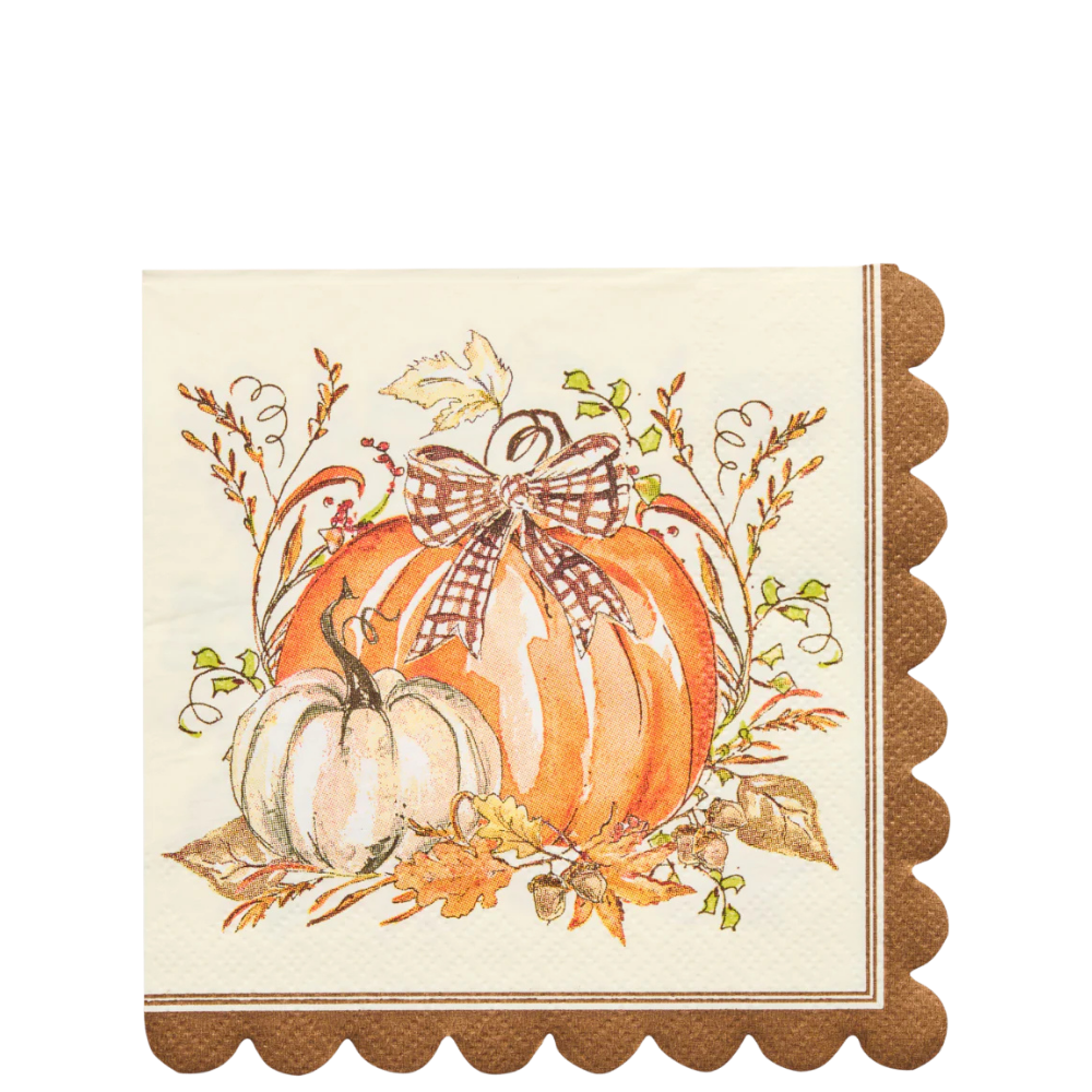 These scalloped cocktail napkins feature the most charming pumpkin illustrations and are the perfect way to bring seasonal charm to your gatherings. Whether used to hold appetizers or placed under your beverage at the dinner table, these napkins bring both practicality and elegance to your autumn celebrations.