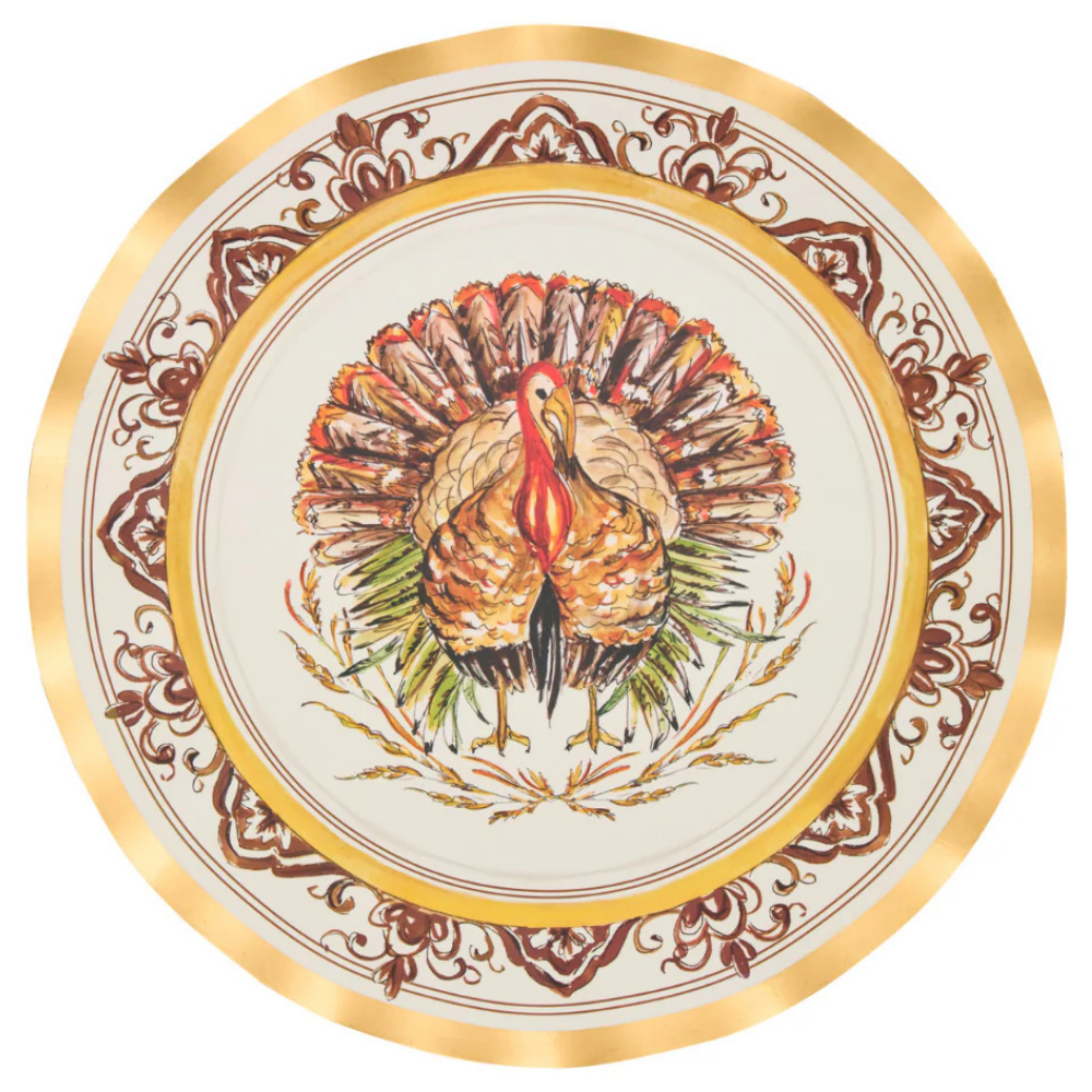 These wavy-edge dinner plates from our Turkey & Gourds collection feature shimmering gold foil wavy edges and a beautifully illustrated turkey at the center. They're the perfect festive and charming addition to any Thanksgiving table or fall celebration.