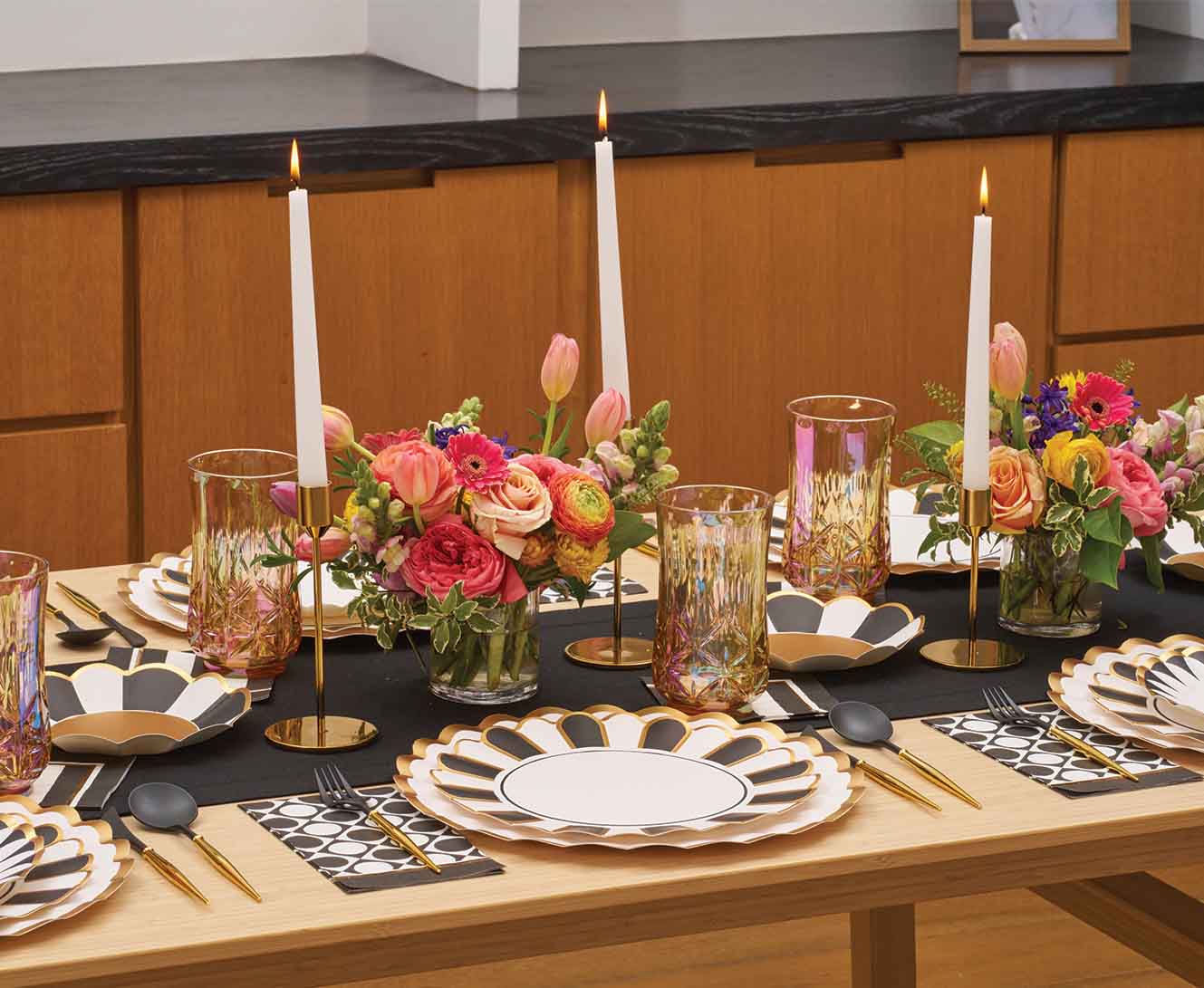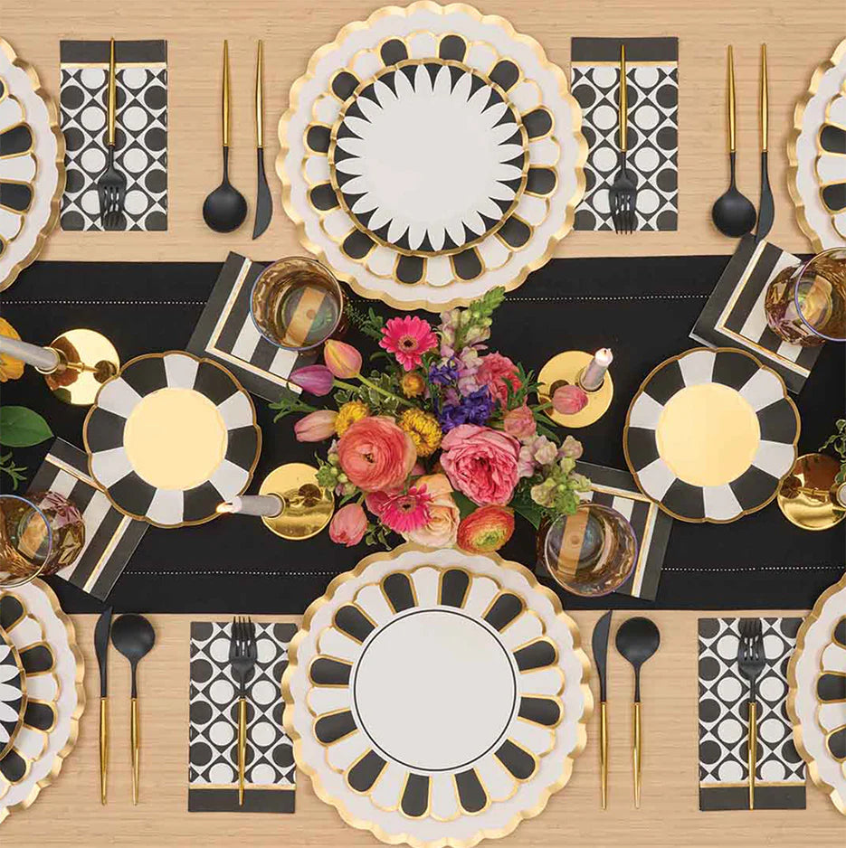 Our black & white 'Cordoba' collection is the perfect setting for a wide range of events. These pieces feature stunning gold metallic accents that will elevate your dinner table and leave your guests stunned that they're paper.