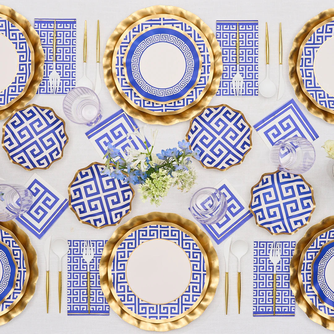 Create an Instagram-worthy professional tablescape with our new Greek Key collection! Perfect for any celebration, this table setting is adorned with the timeless blue and white pattern of ancient Greece.