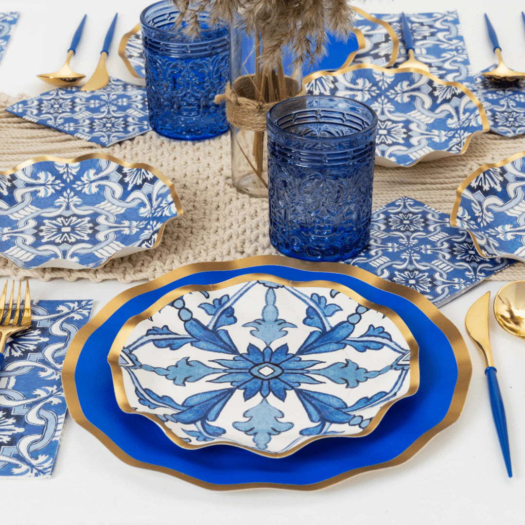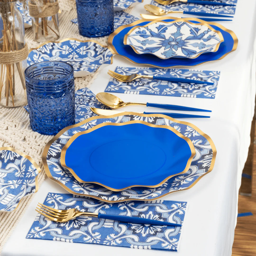 This timeless Moroccan pattern incorporates a metallic gold rim that pairs perfectly with our Gold Bella cutlery & Satin Gold wavy plates. Your guests will not believe this is all disposable!