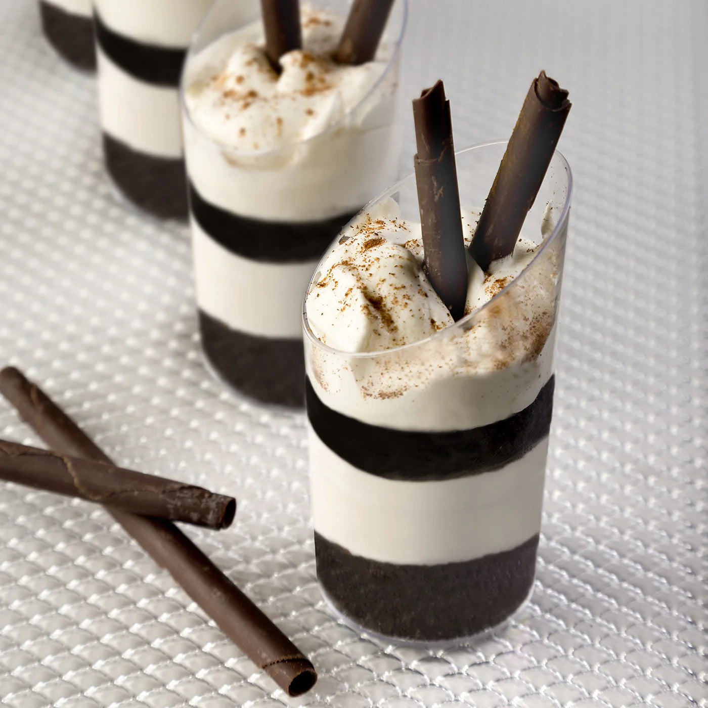 Showcase your delicious hors d'oeuvres and desserts with our 3 oz. Mini Angle Cups. Perfect for parties, these clear cups are a stylish and convenient option. Impress your guests with these modern and versatile cups in a 12 count pack.