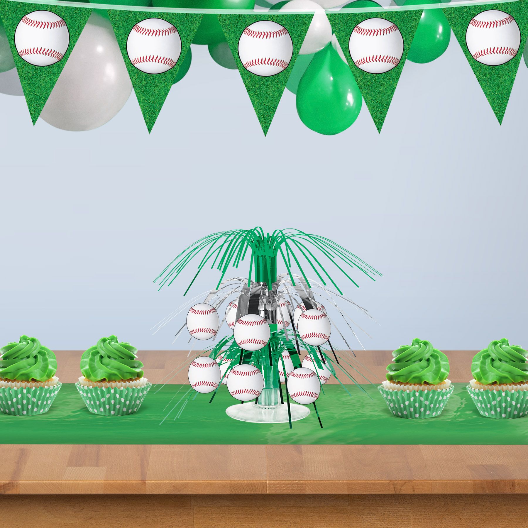 Introducing the Baseball Mini Cascade Centerpiece, measuring at 7.5 inches. Perfect for adding a touch of sports-themed decor to any party or event. This centerpiece is a must-have for any baseball fan. Enhance the atmosphere and bring the game to life with this eye-catching decoration.