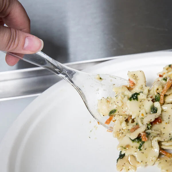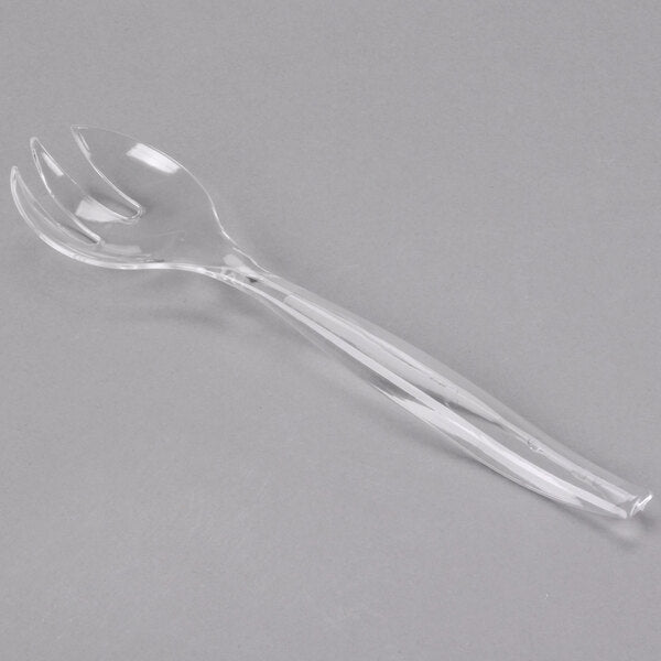 This 10-inch serving fork is made of clear plastic, providing both durability and visibility. Perfect for serving a variety of foods at events or gatherings, this fork is a versatile and practical addition to any kitchen or catering service.