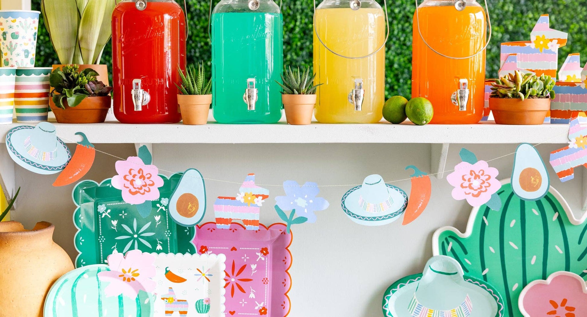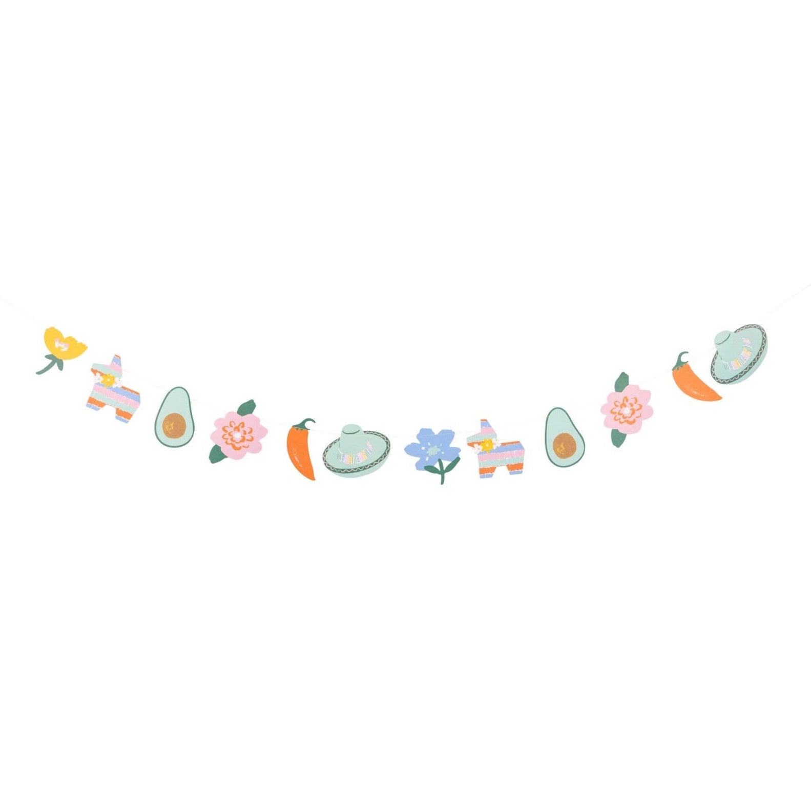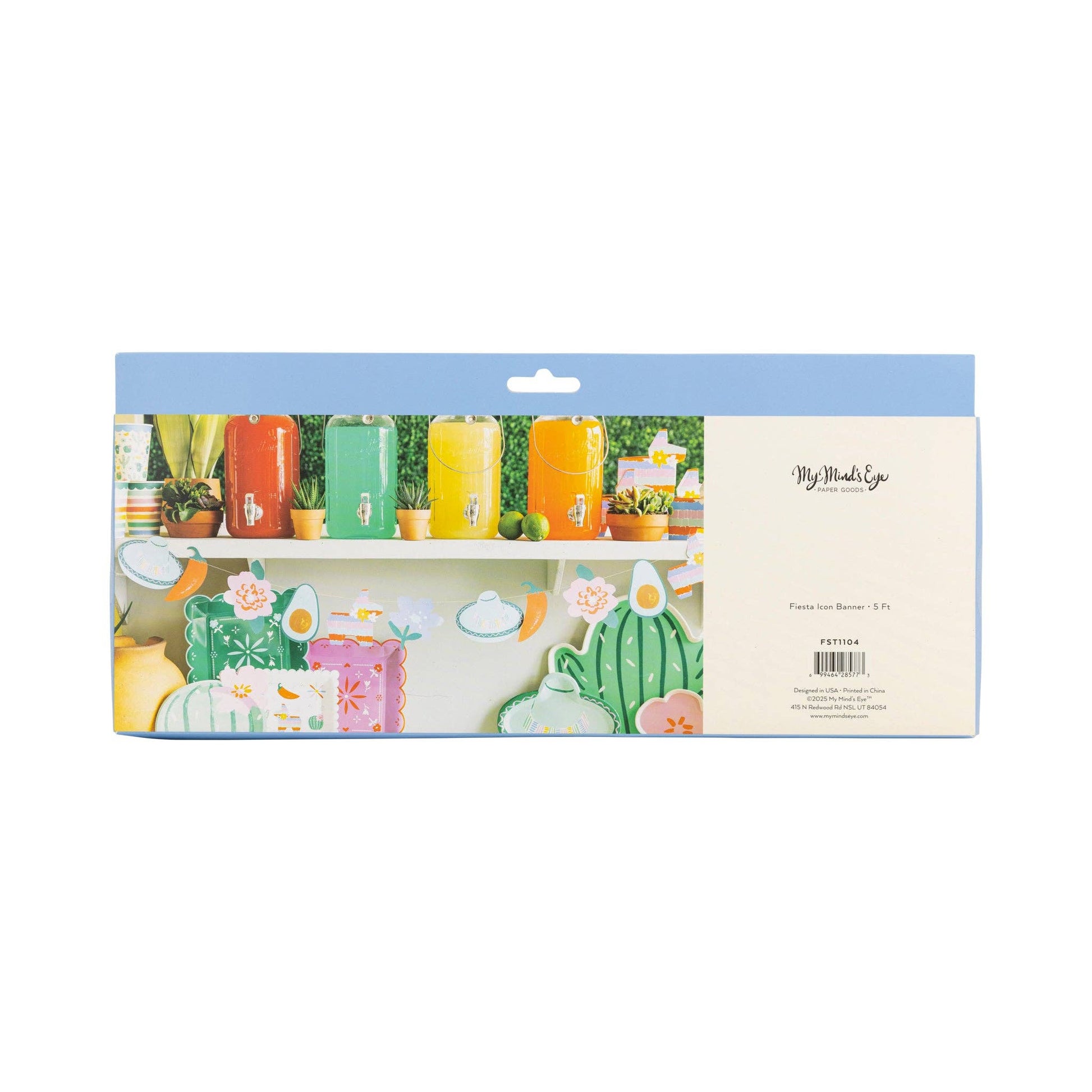 Add a festive touch to your party with our Fiesta Icon Banner. Featuring vibrant fiesta icons, this banner will liven up any celebration with its playful and quirky design. Get ready to fiesta like there's no mañana! • Includes 1 paper banner, approximately 5' long • 12 Paper pieces • Pieces are approximately 5" tall.