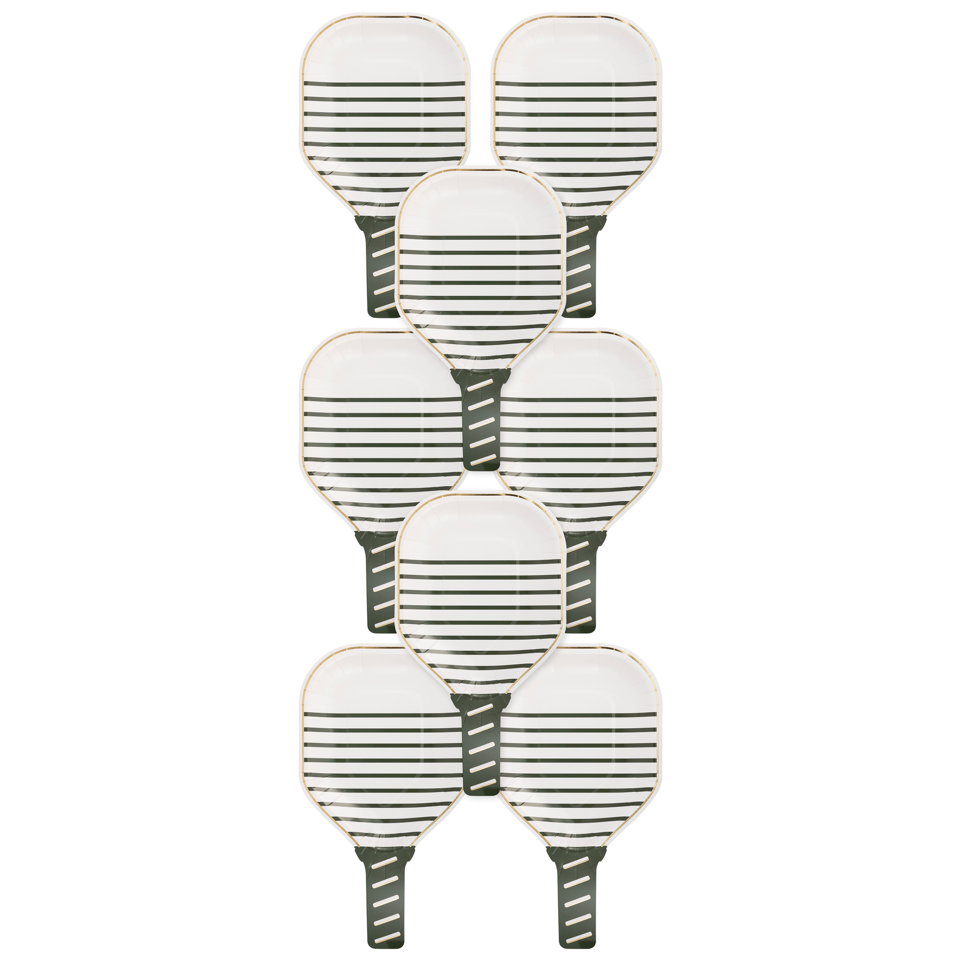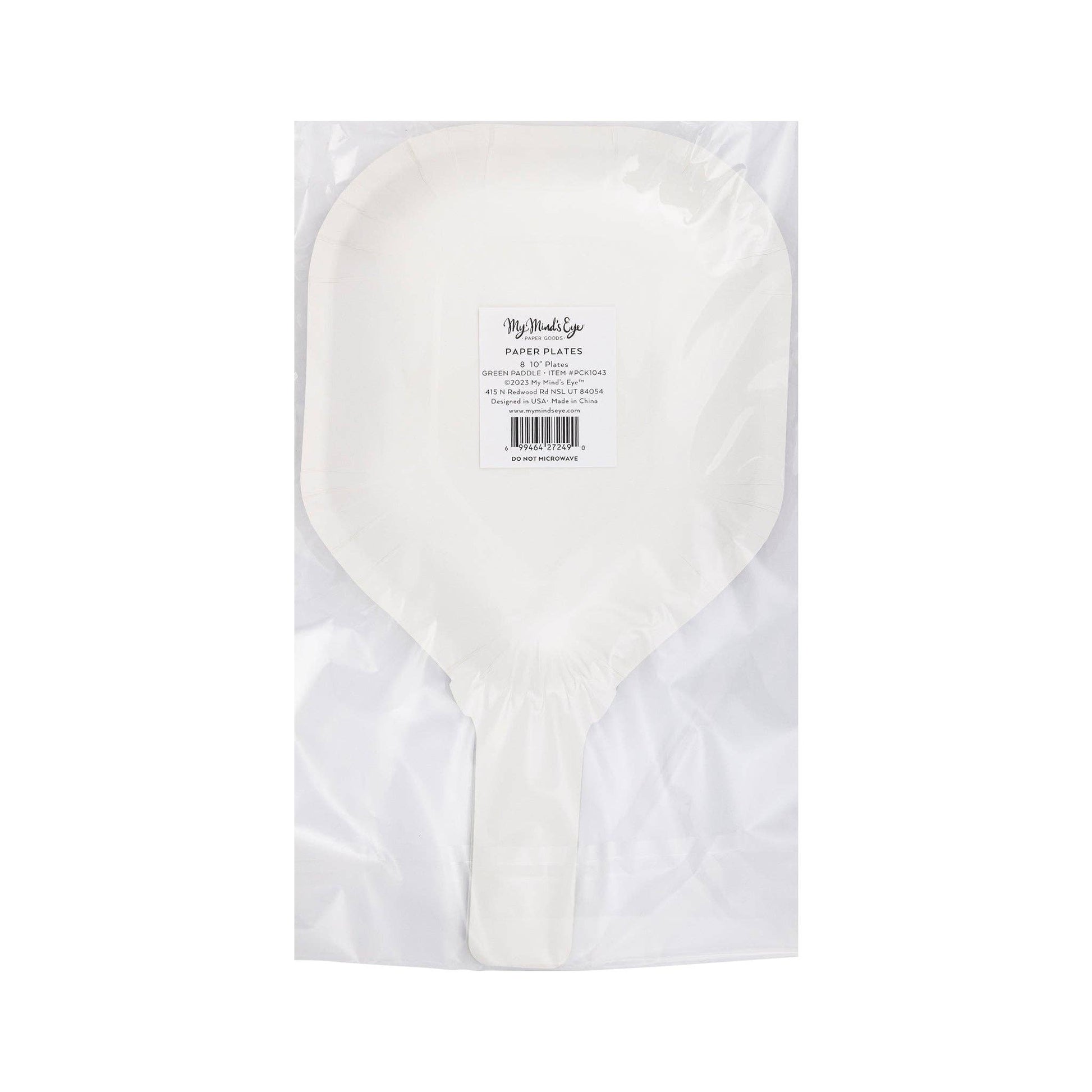 Be the talk of your next party with our White Paddle Plate! This uniquely shaped plate is perfect for serving up all your party treats and adding a touch of fun to the table. Serve up some aces with this unique plate that is sure to be a hit with pickleball enthusiasts and party-goers alike. • includes 8 paper plates • 6" x 10" • gold foil.