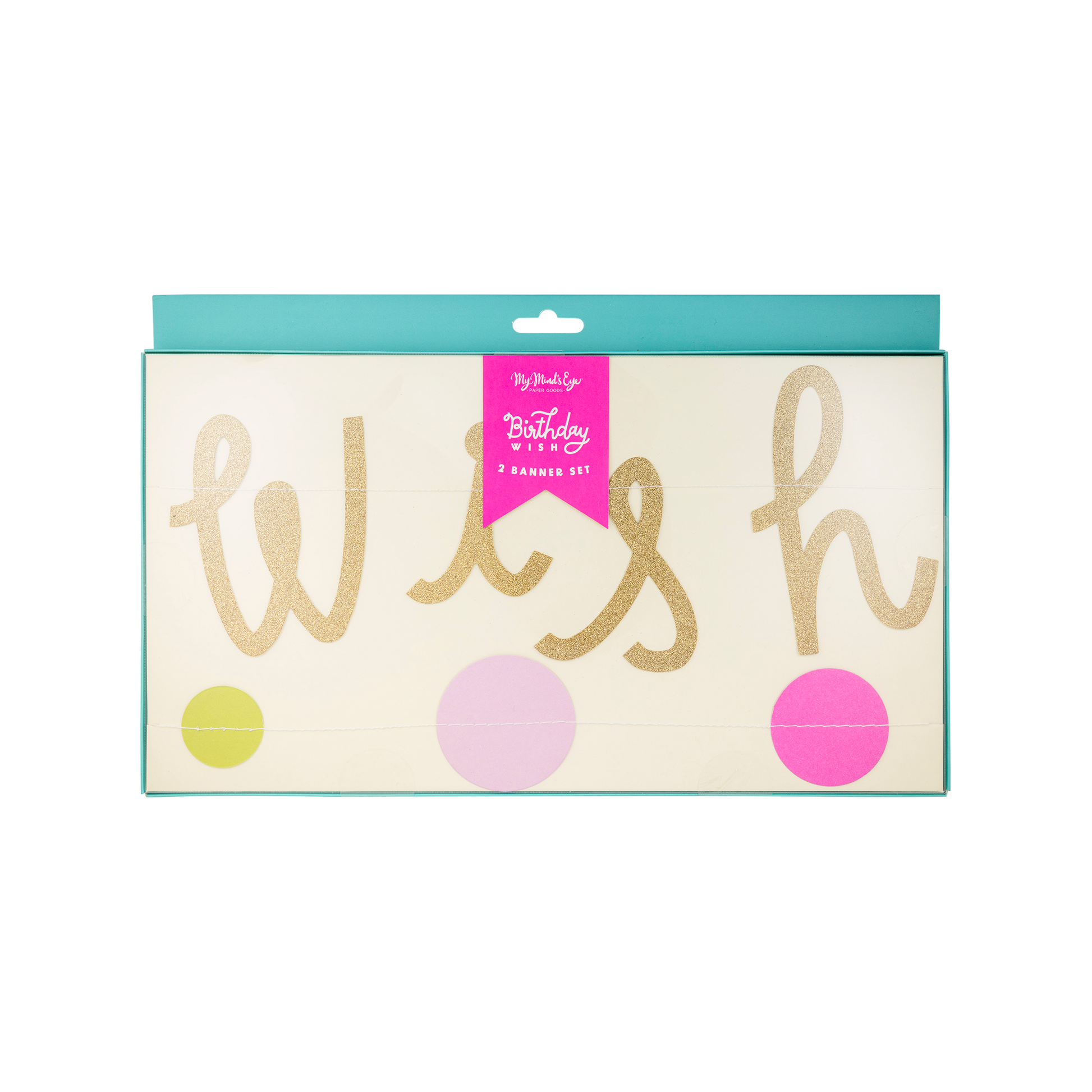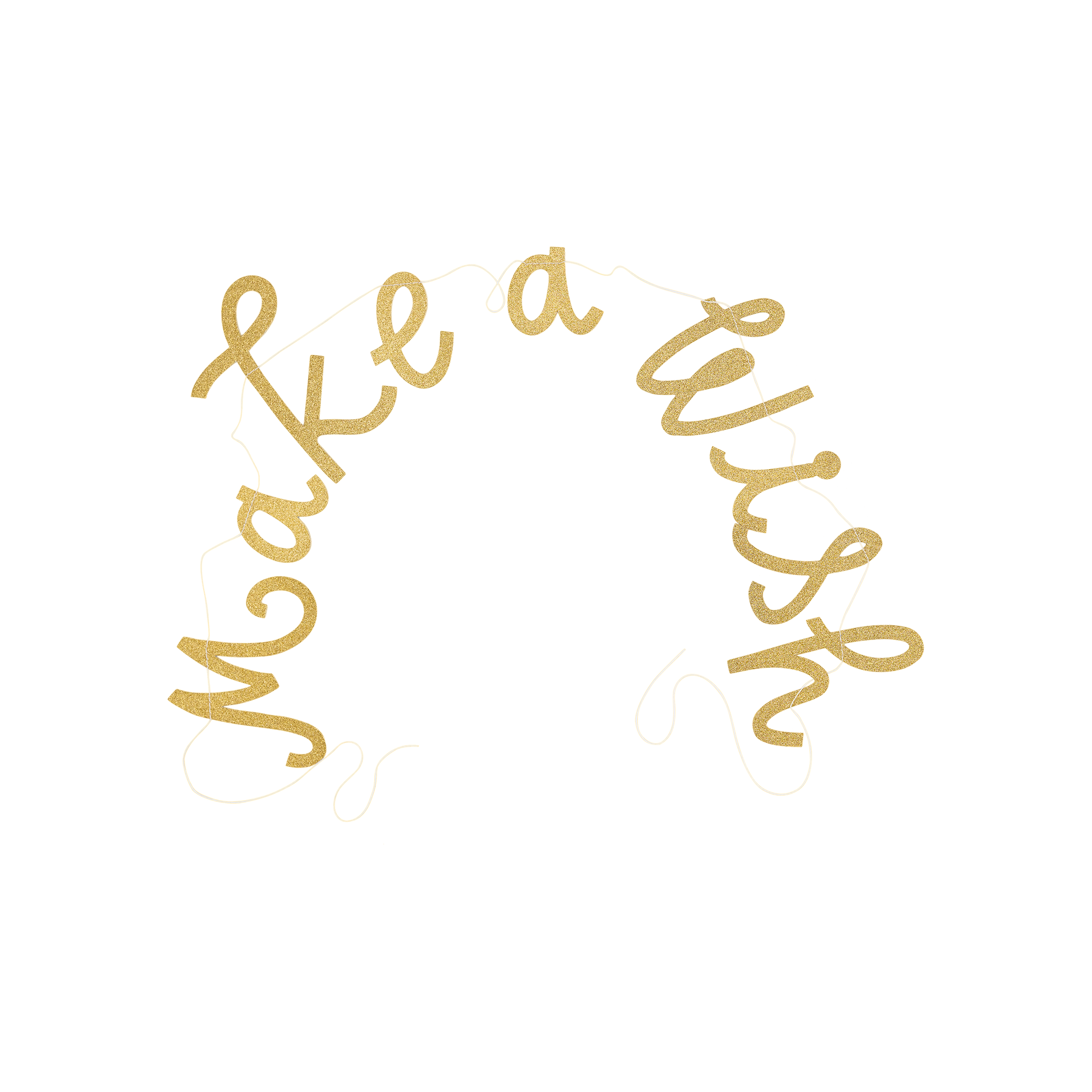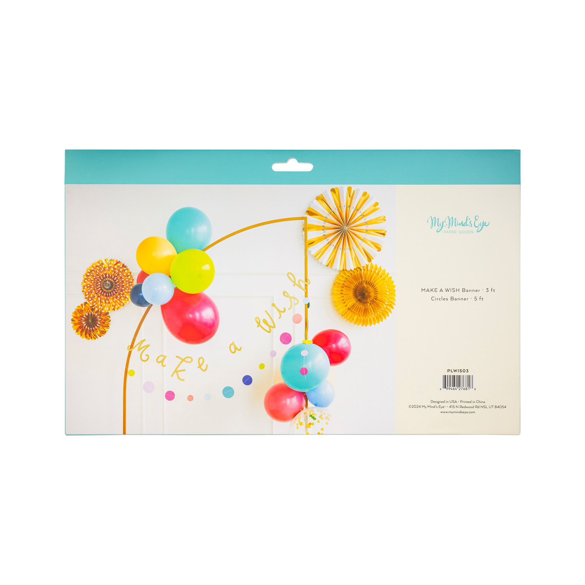Make all your birthday wishes come true with the perfect Make A Wish banner set! This festive and fun set will add a touch of magic to any celebration. With its playful design it's sure to make everyone smile. • includes 2 sewn banners • MAKE A WISH Banner - 3 ft, gold glitter • Circles Banner - 5 ft